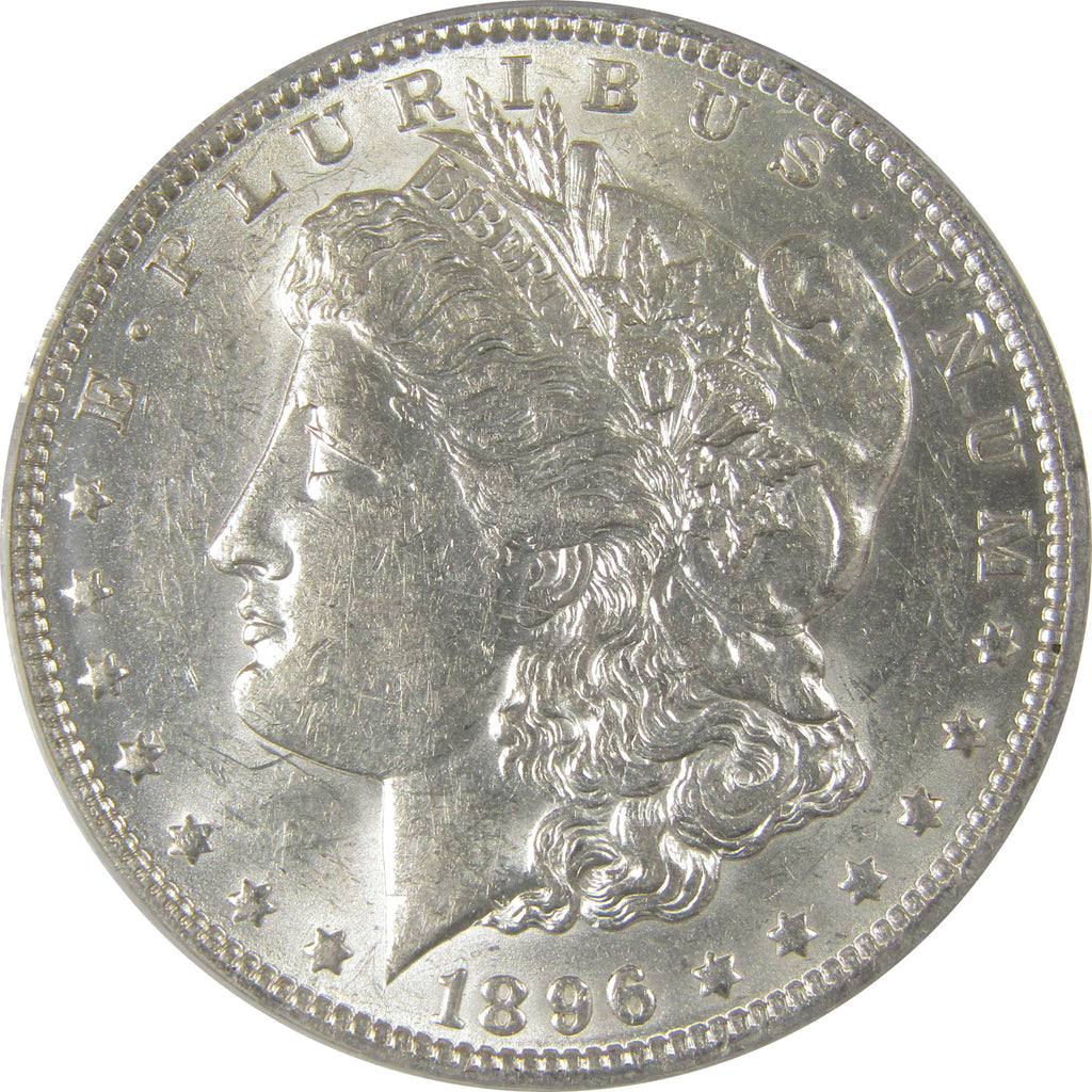 A genuine 1896 O Morgan Silver Dollar Coin, graded and certified AU 53 by ANACS. Contains 90% Silver