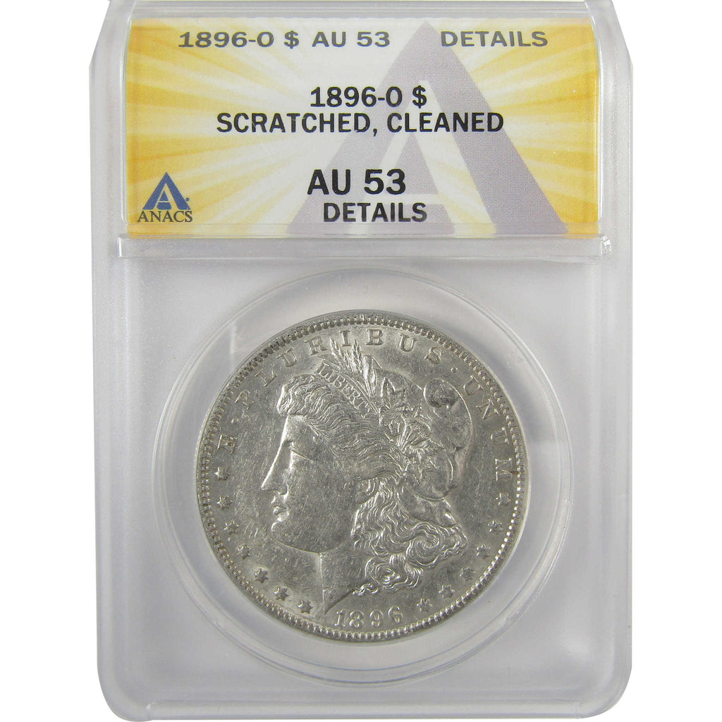 A genuine 1896 O Morgan Silver Dollar Coin, graded and certified AU 53 Details by ANACS. Contains 90% Silver. Scratched & Cleaned