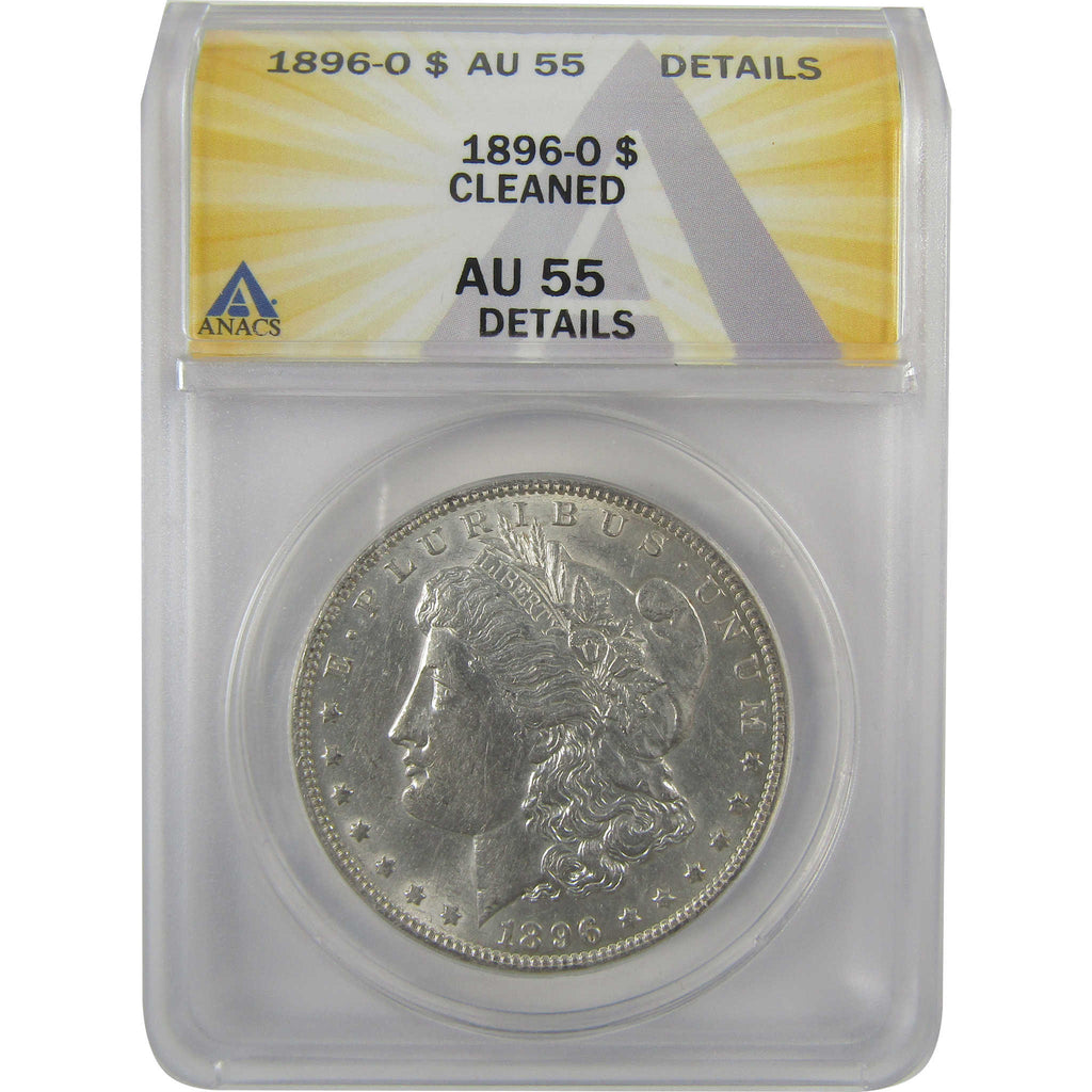 A genuine 1896 O Morgan Silver Dollar Coin, graded and certified AU 55 Details by ANACS. Contains 90% Silver. Cleaned