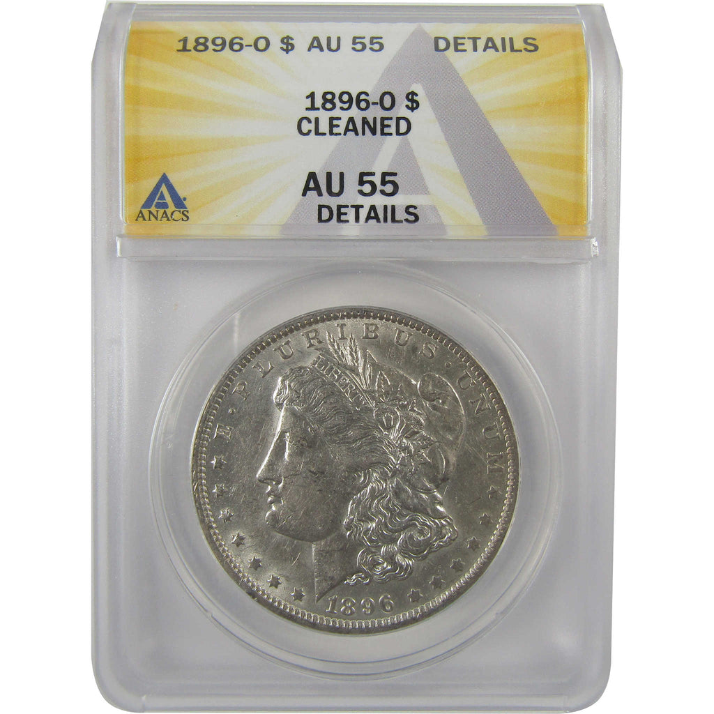 A genuine 1896 O Morgan Silver Dollar Coin, graded and certified AU 55 Details by ANACS. Contains 90% Silver. Cleaned