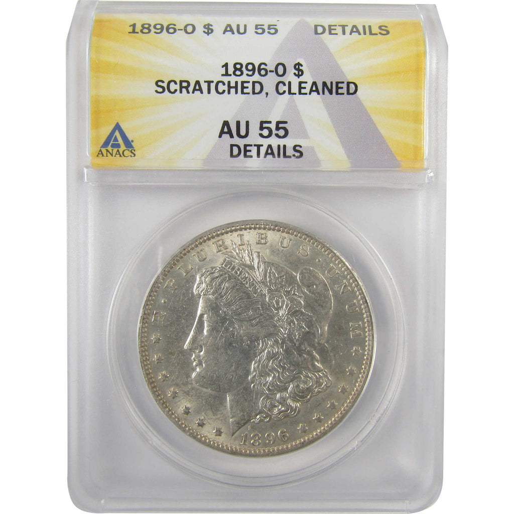 A genuine 1896 O Morgan Silver Dollar Coin, graded and certified AU 55 Details by ANACS. Contains 90% Silver. Scratched & Cleaned