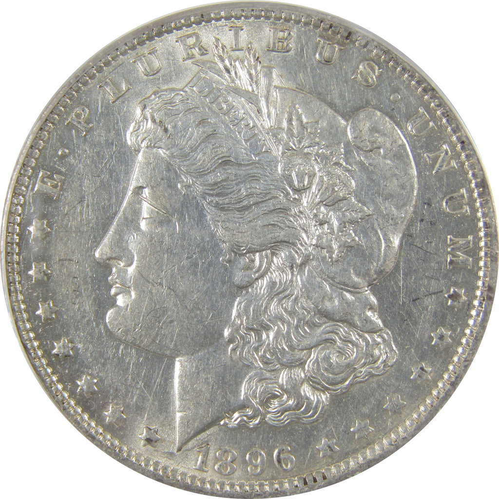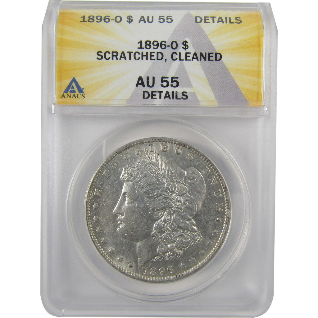 A genuine 1896 O Morgan Silver Dollar Coin, graded and certified AU 55 Details by ANACS. Contains 90% Silver. Scratched & Cleaned