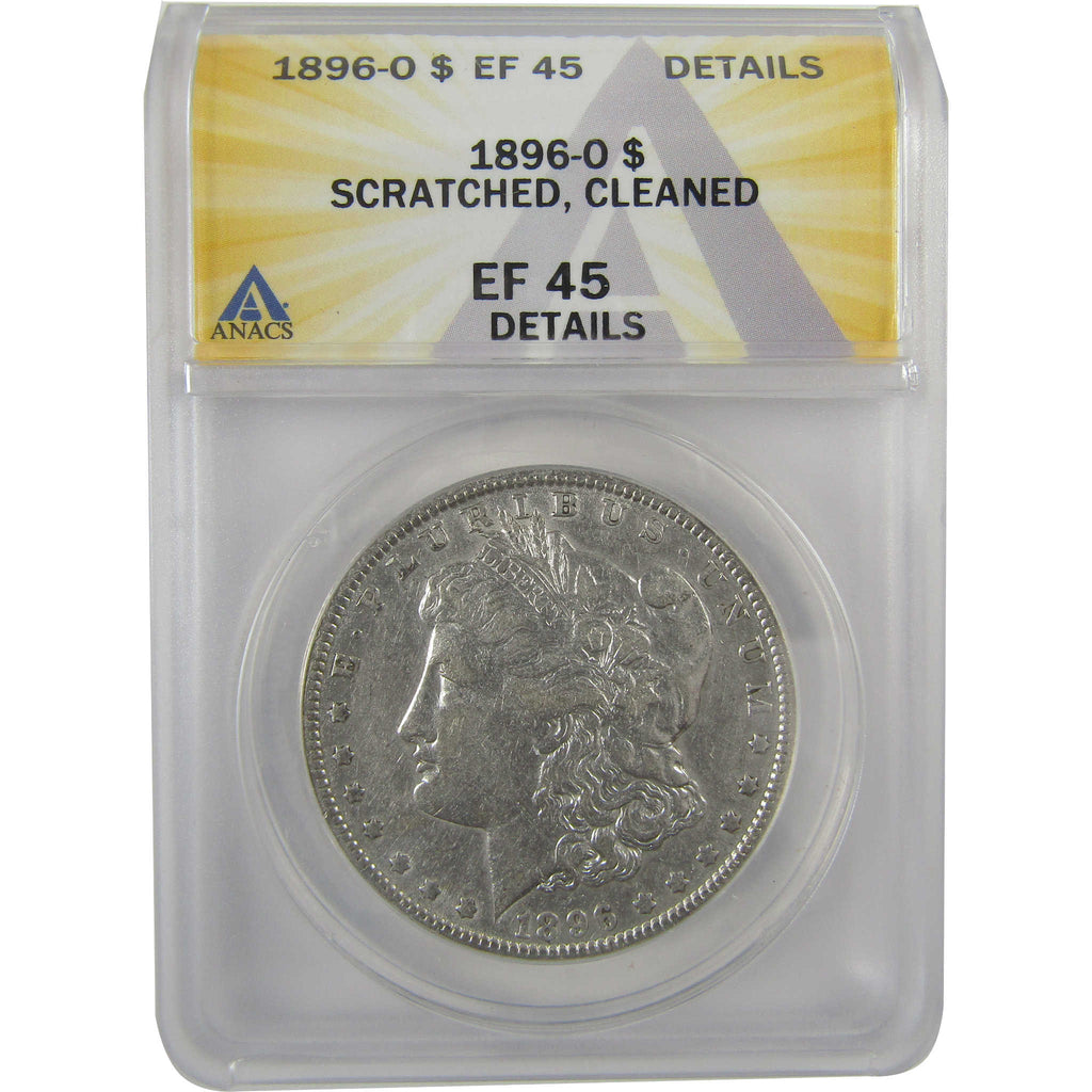 A genuine 1896 O Morgan Silver Dollar Coin, graded and certified EF 45 Details by ANACS. Contains 90% Silver. Scratched & Cleaned