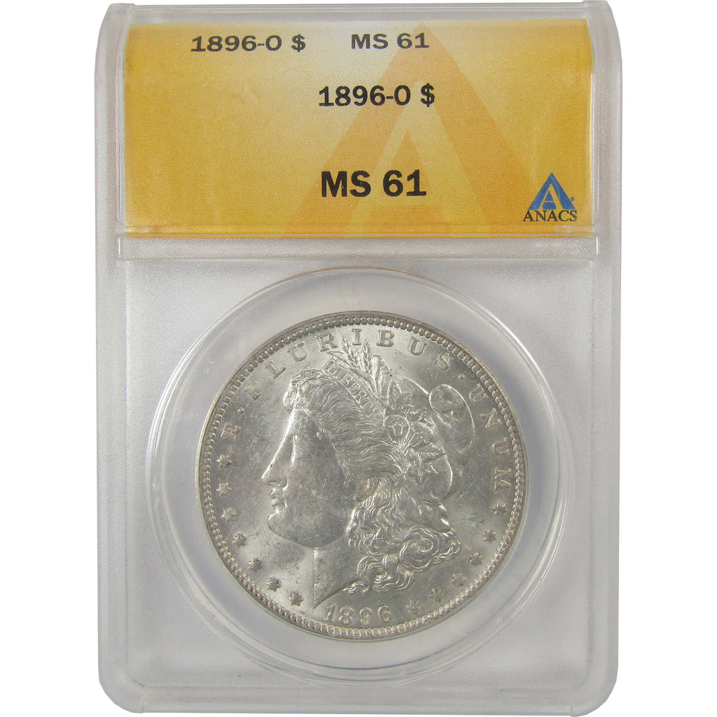 A genuine 1896 O Morgan Silver Dollar Coin, graded and certified MS 61 by ANACS. Contains 90% Silver