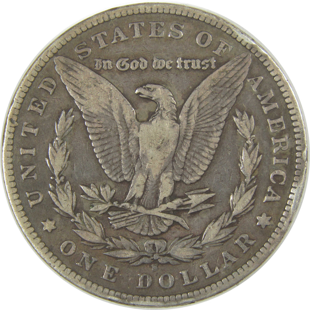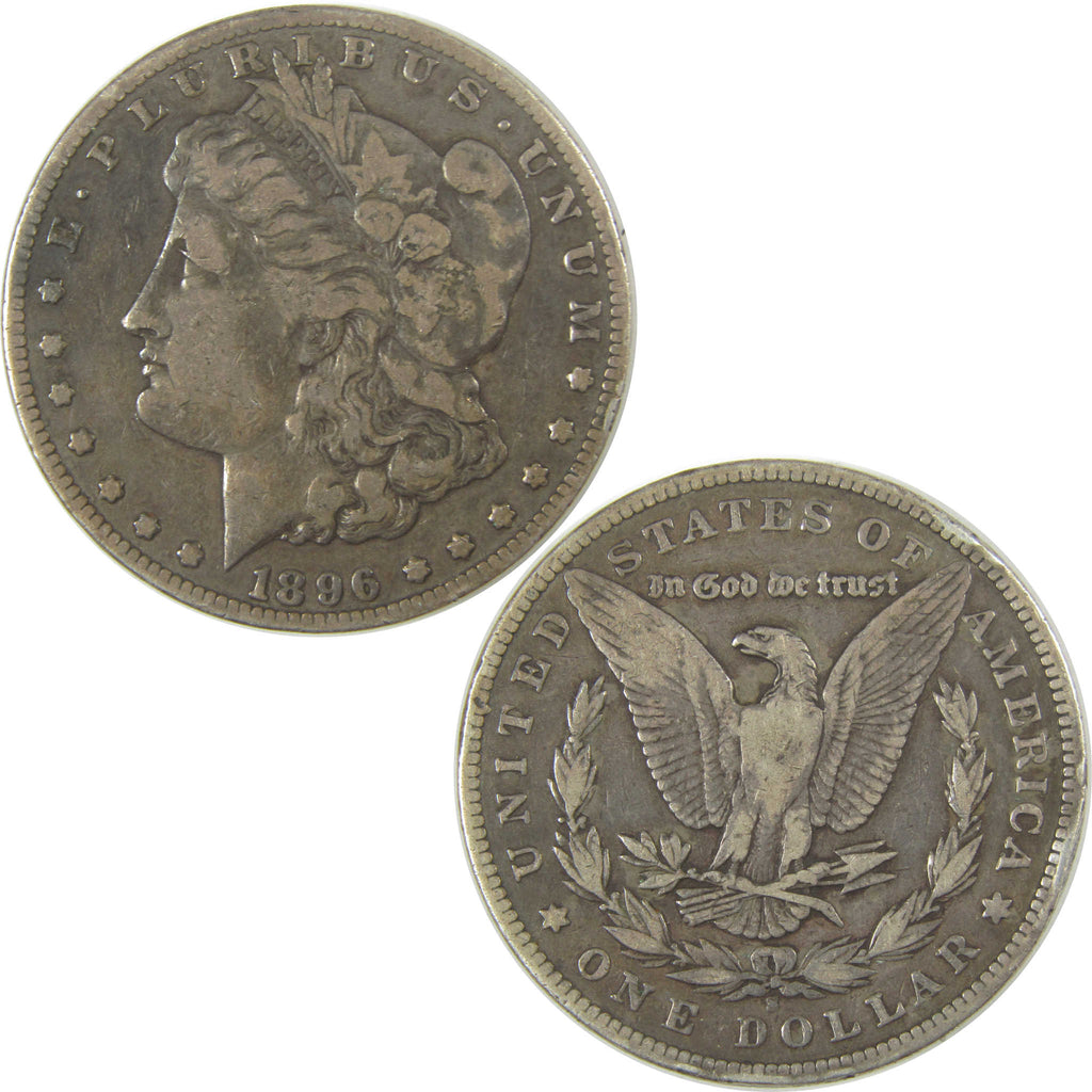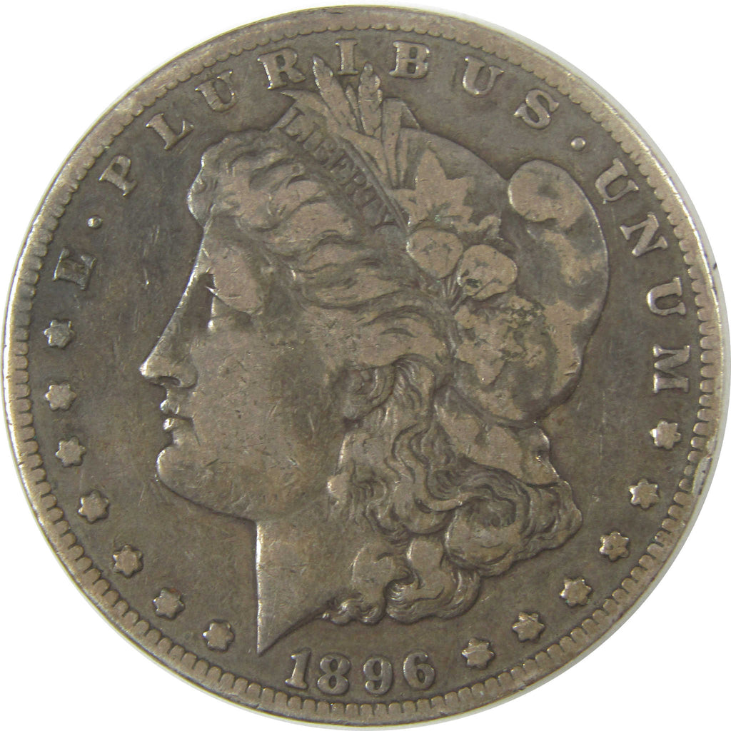 A genuine 1896 S Morgan Silver Dollar Coin, in F Fine Details Condition. Contains 90% Silver. Rim Damage