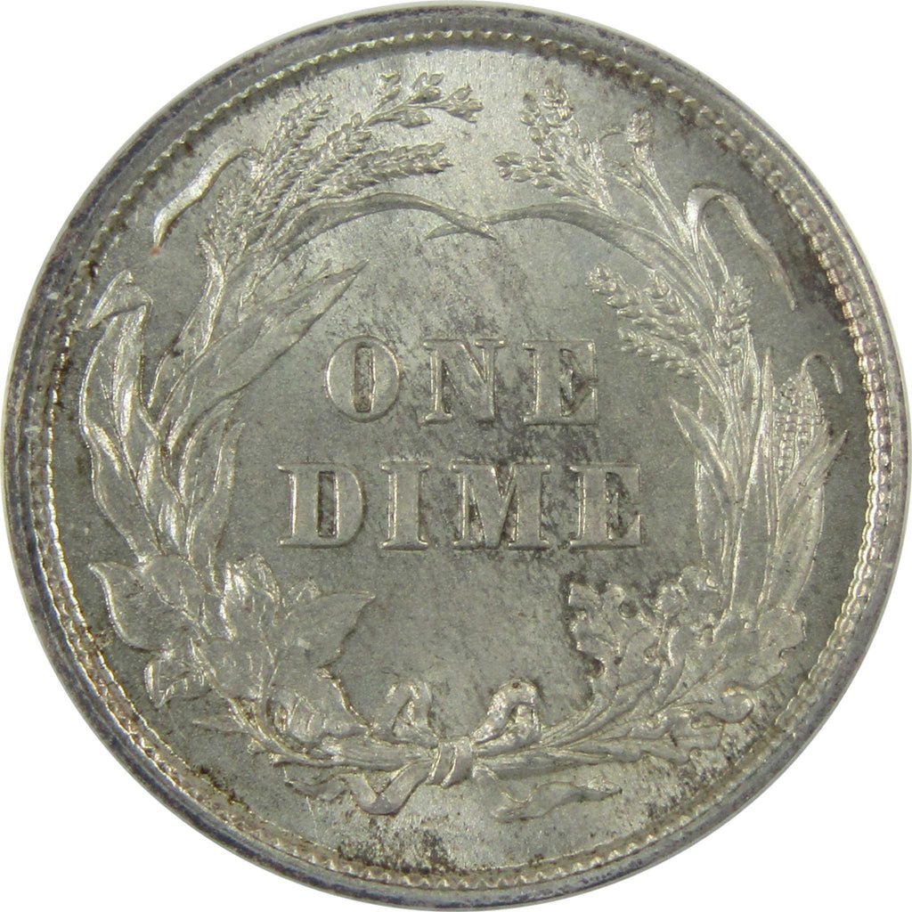 Known as the Barber dime after its designer, this classic Liberty Head dime was struck in 90% silver. Its obverse depicts Liberty facing right wearing a Phrygian cap and laurel wreath, while the reverse shows a wreath and the denomination ONE DIME.