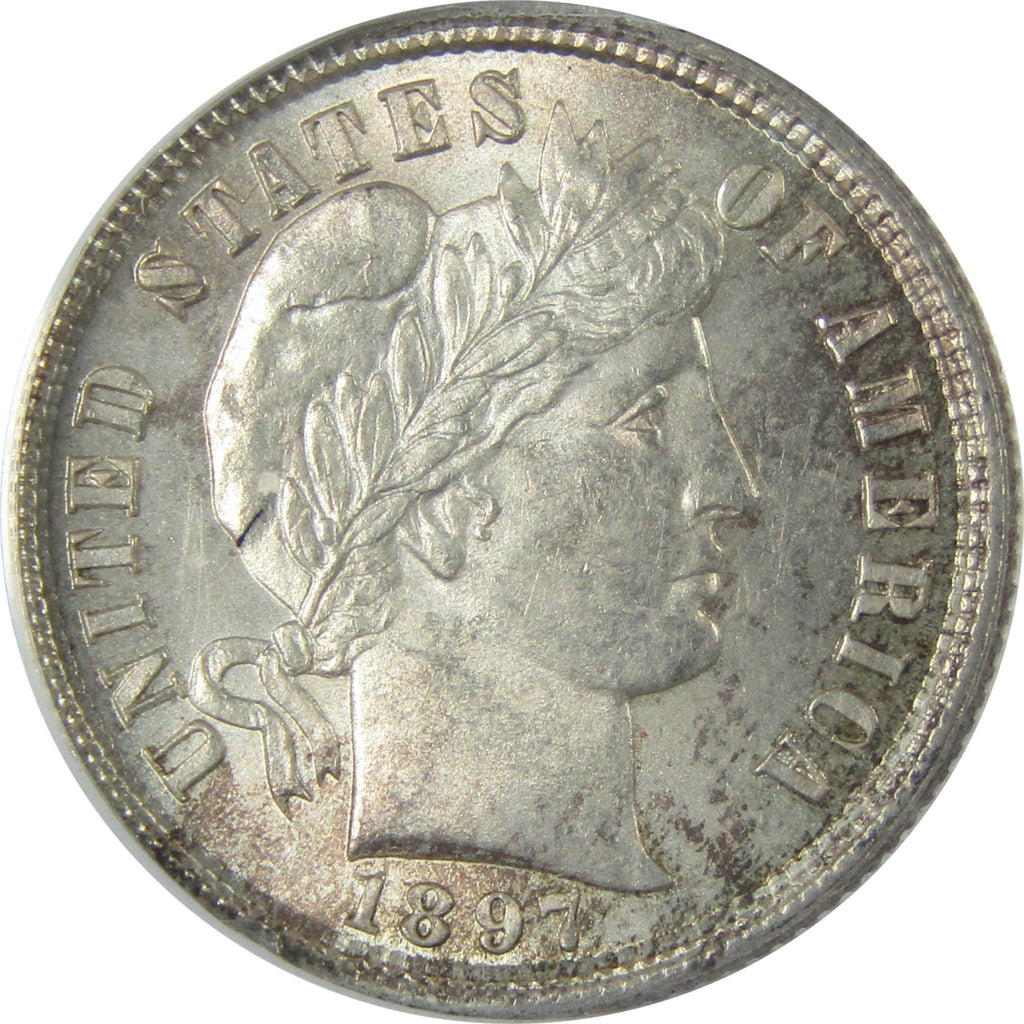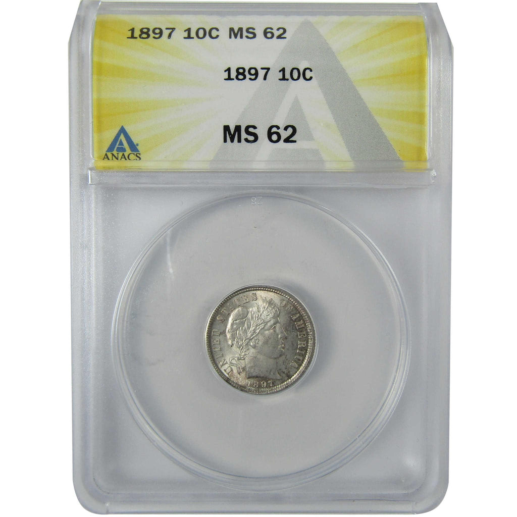 A genuine 1897 Barber Silver Dime Coin, graded and certified MS 62 by ANACS. Contains 90% Silver