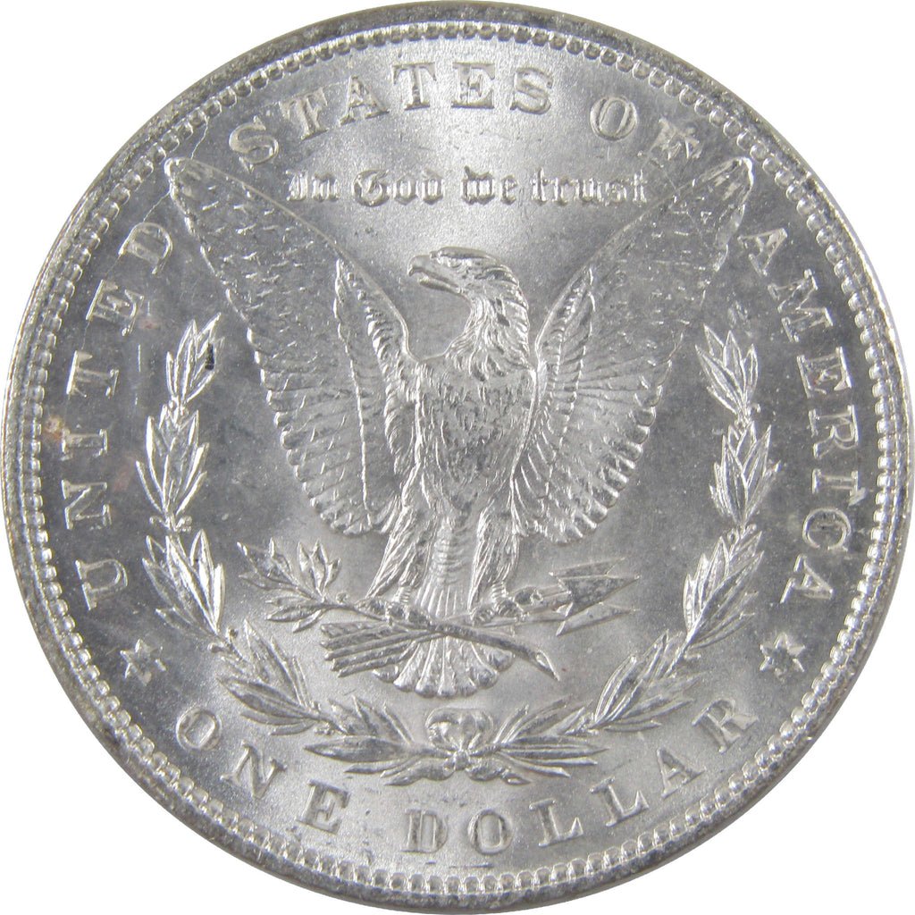 This large 90% silver Morgan dollar bears George T. Morgan's classic depiction of Liberty facing left in a Phrygian cap and a spray of leaves held by a ribbon inscribed LIBERTY. The reverse features an eagle clutching a branch and three arrows.