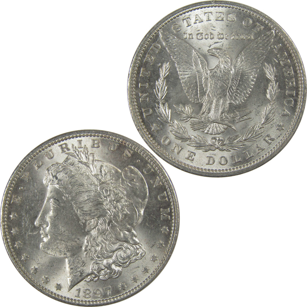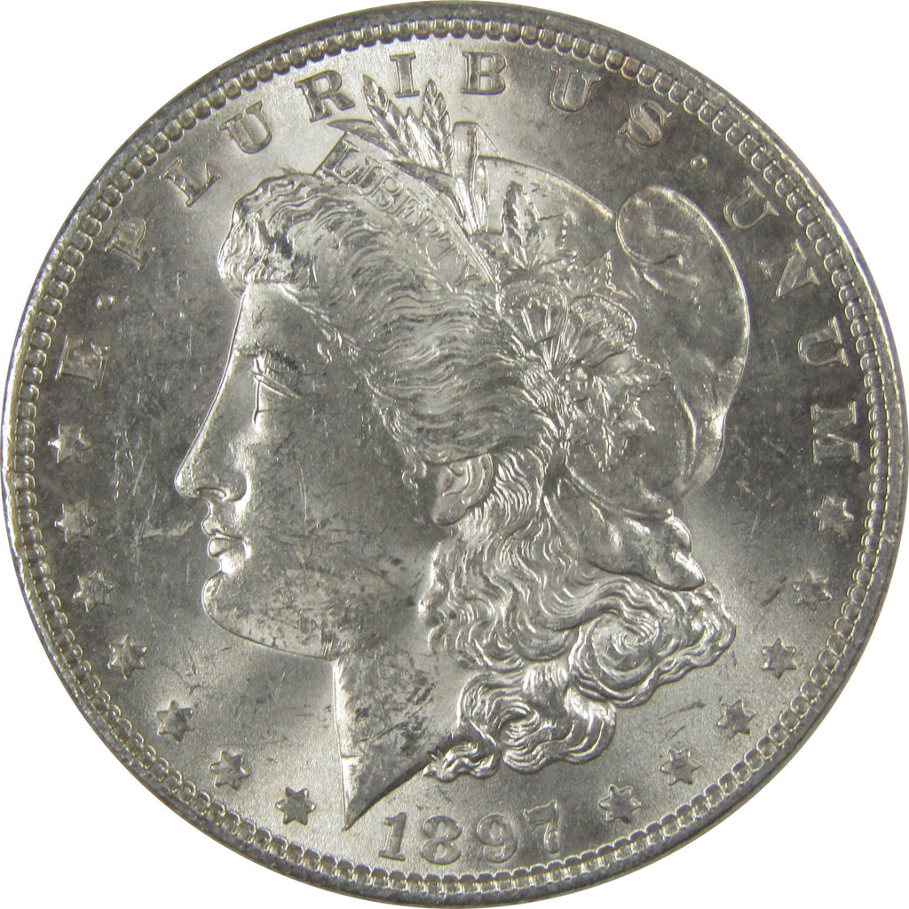 A genuine 1897 Morgan Silver Dollar Coin, in Uncirculated Mint State Condition. Contains 90% Silver