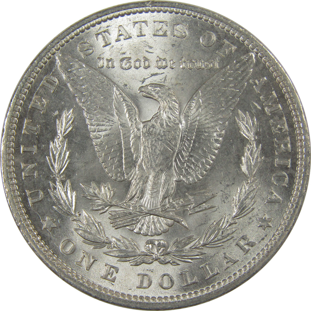 This large 90% silver Morgan dollar bears George T. Morgan's classic depiction of Liberty facing left in a Phrygian cap and a spray of leaves held by a ribbon inscribed LIBERTY. The reverse features an eagle clutching a branch and three arrows.