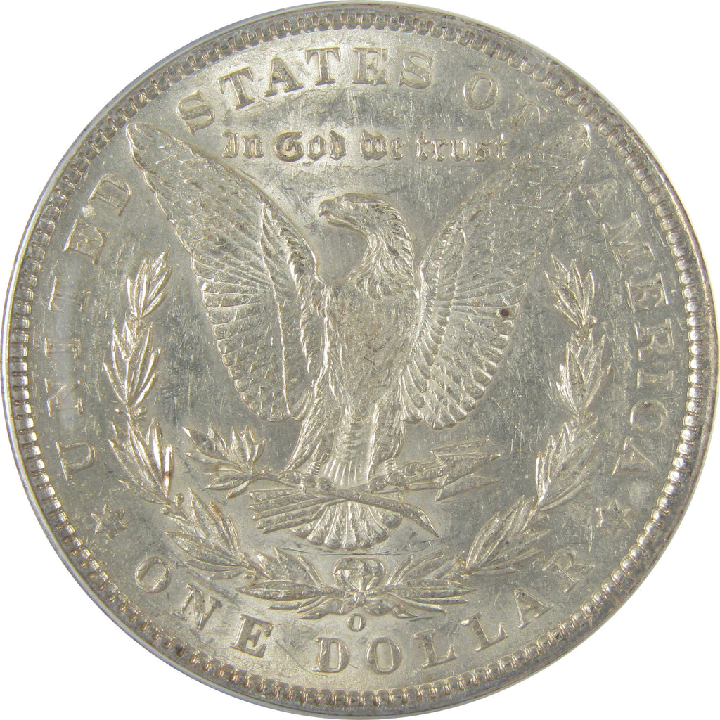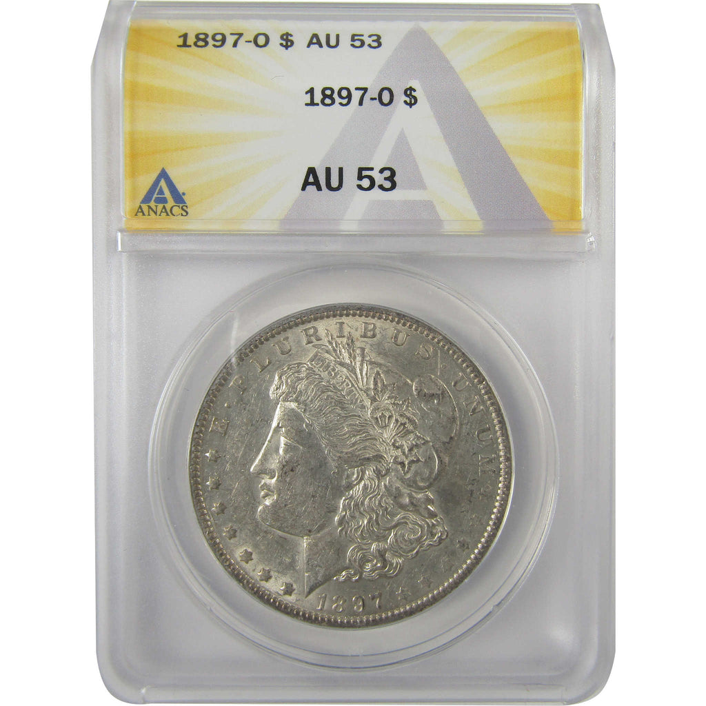 A genuine 1897 O Morgan Silver Dollar Coin, graded and certified AU 53 by ANACS. Contains 90% Silver
