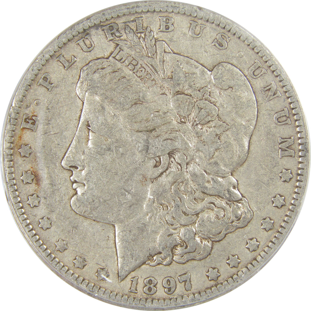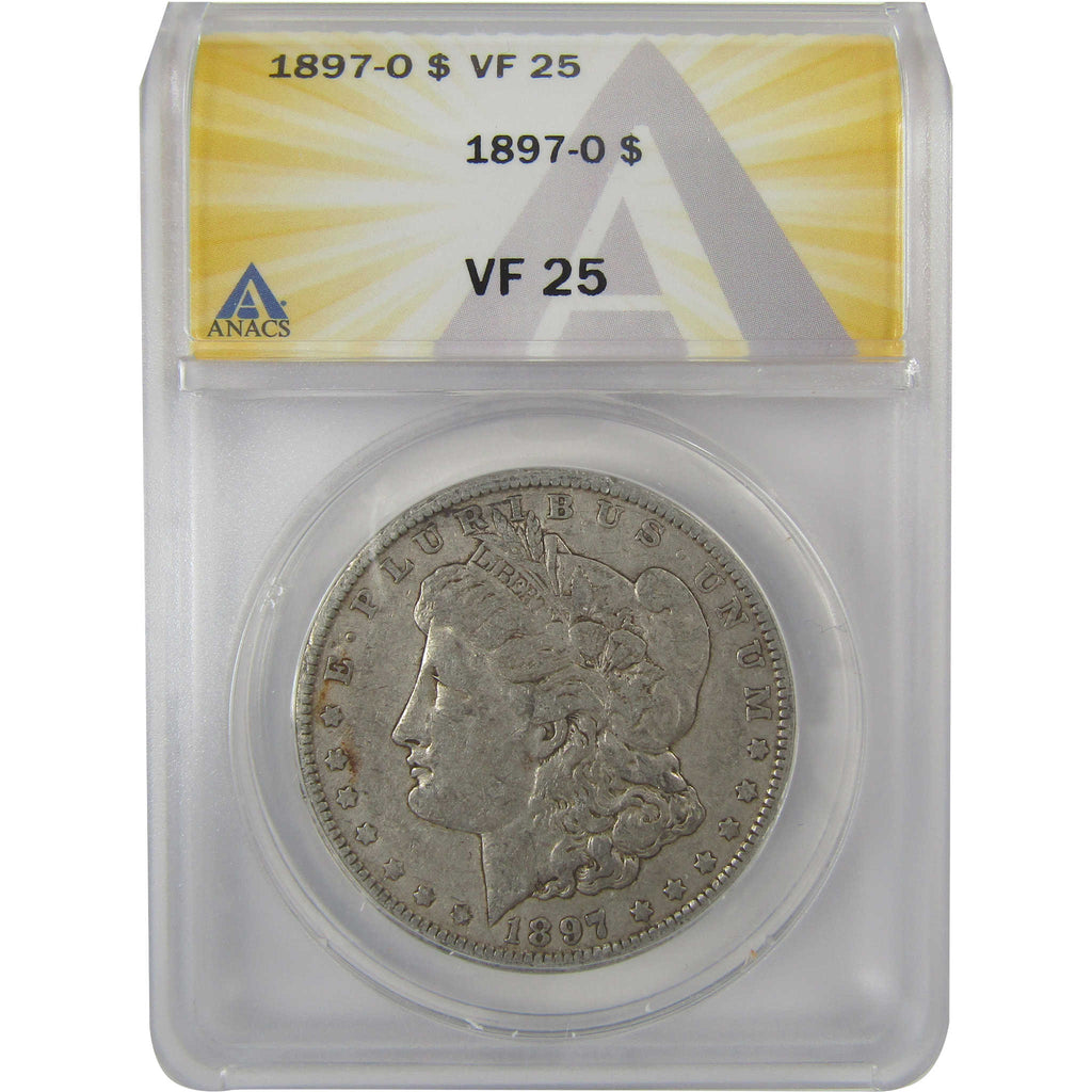A genuine 1897 O Morgan Silver Dollar Coin, graded and certified VF 25 by ANACS. Contains 90% Silver