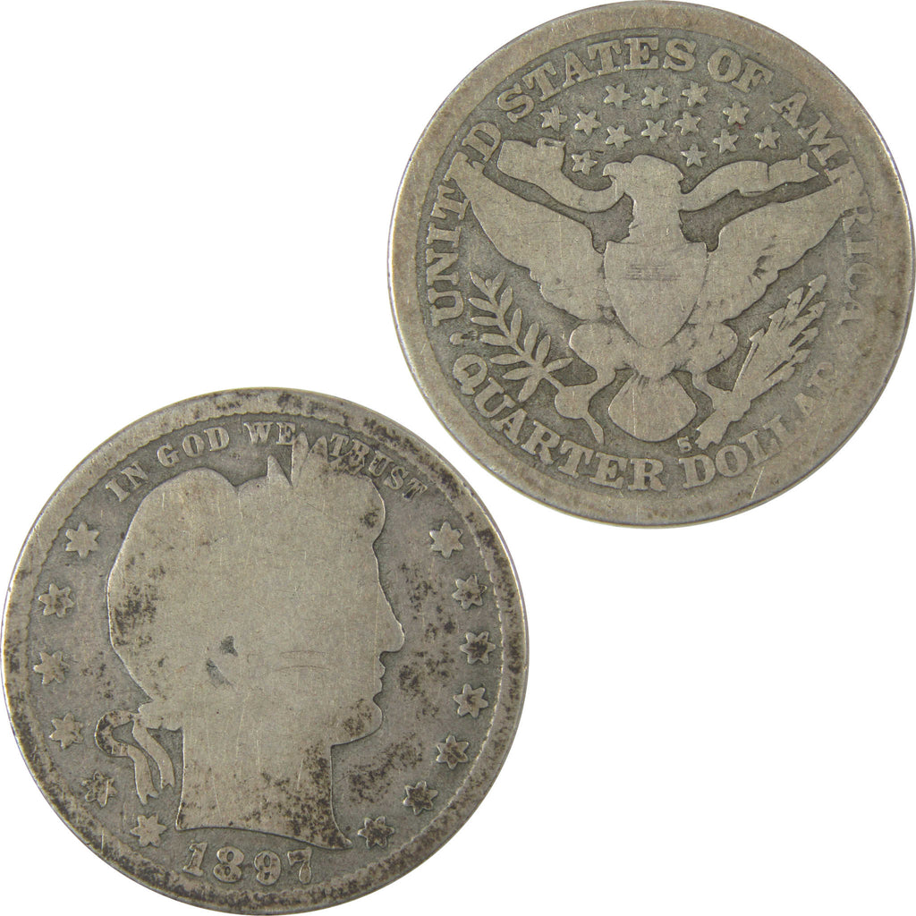 A genuine 1897 S Barber Silver Quarter Coin, in AG About Good Condition. Contains 90% Silver