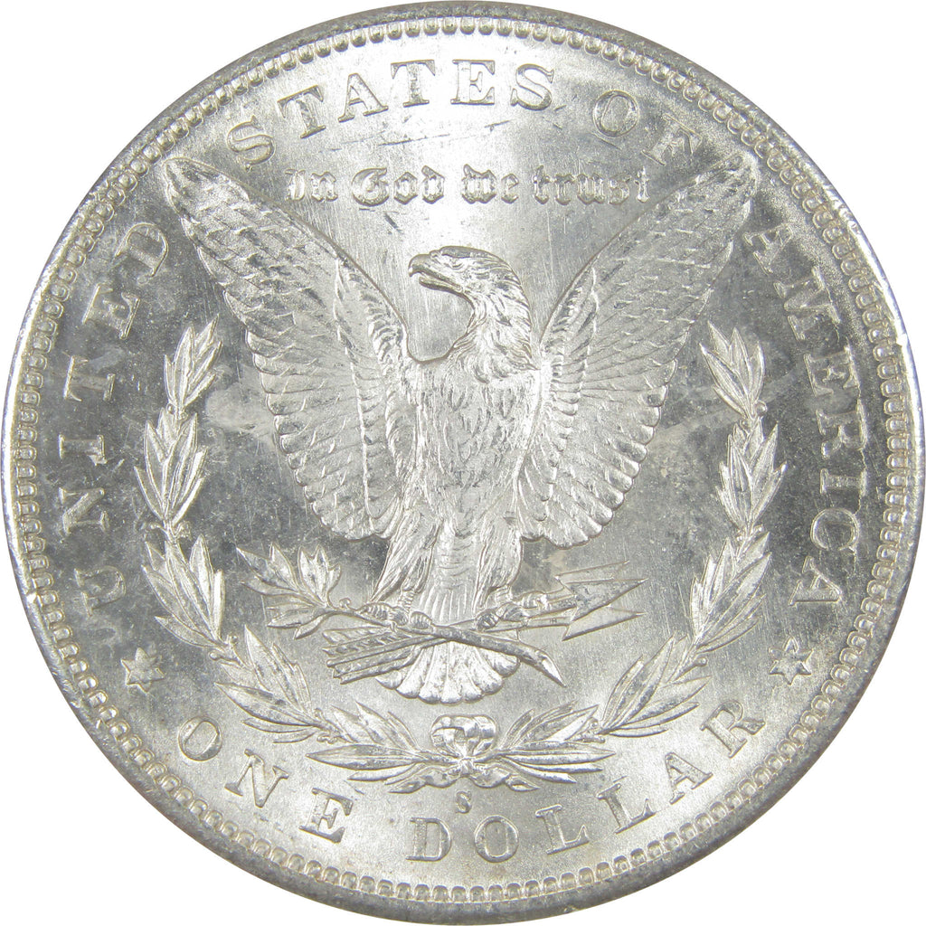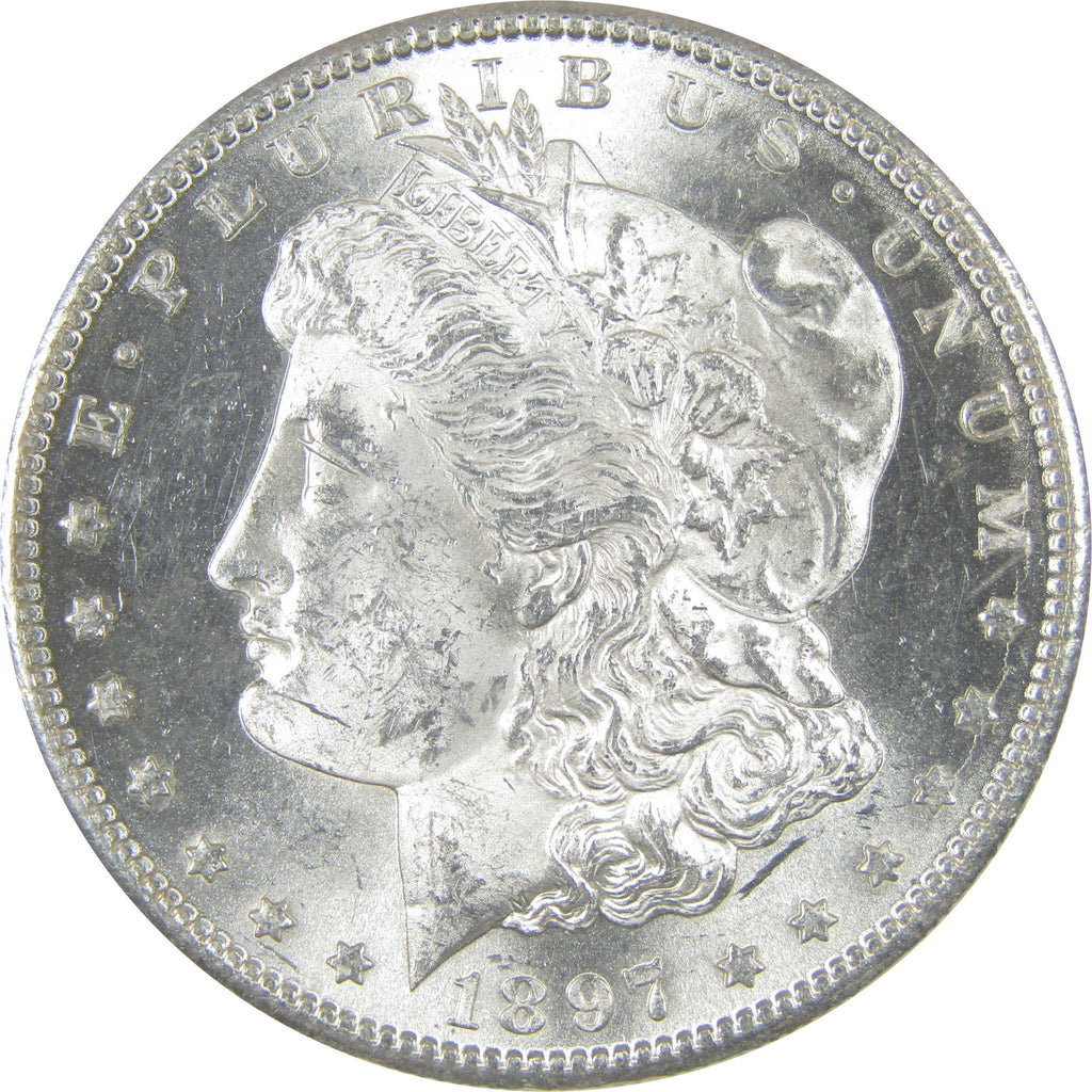 A genuine 1897 S Morgan Silver Dollar Coin, in BU Choice Uncirculated Mint State Condition. Contains 90% Silver