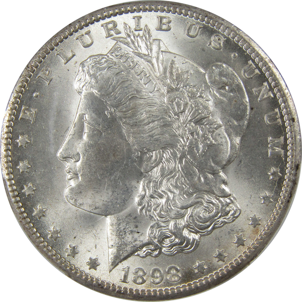 A genuine 1898 O Morgan Silver Dollar Coin, graded and certified MS 63 by PCGS. Contains 90% Silver