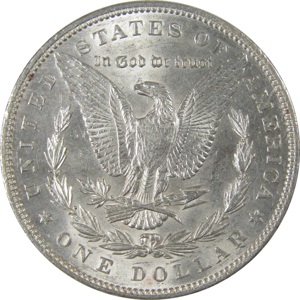 This large 90% silver Morgan dollar bears George T. Morgan's classic depiction of Liberty facing left in a Phrygian cap and a spray of leaves held by a ribbon inscribed LIBERTY. The reverse features an eagle clutching a branch and three arrows.