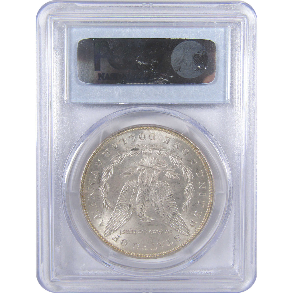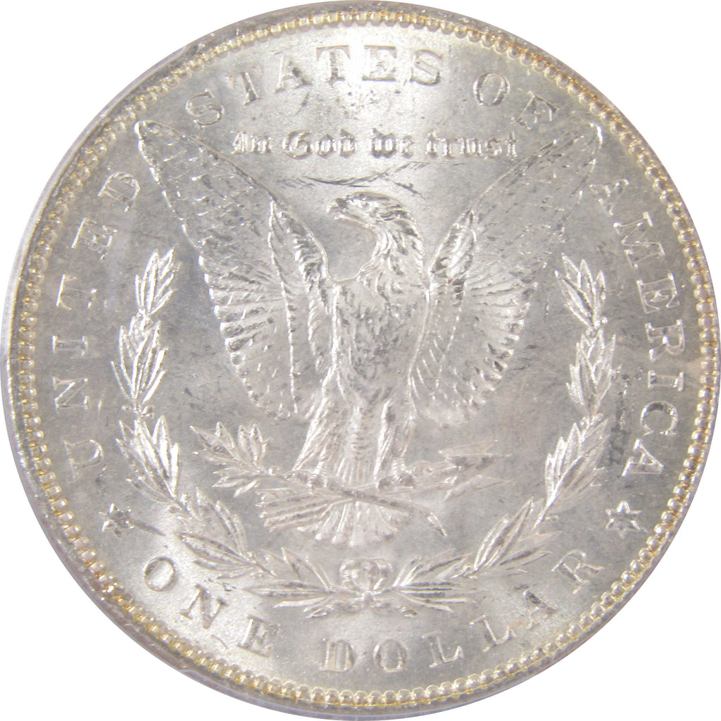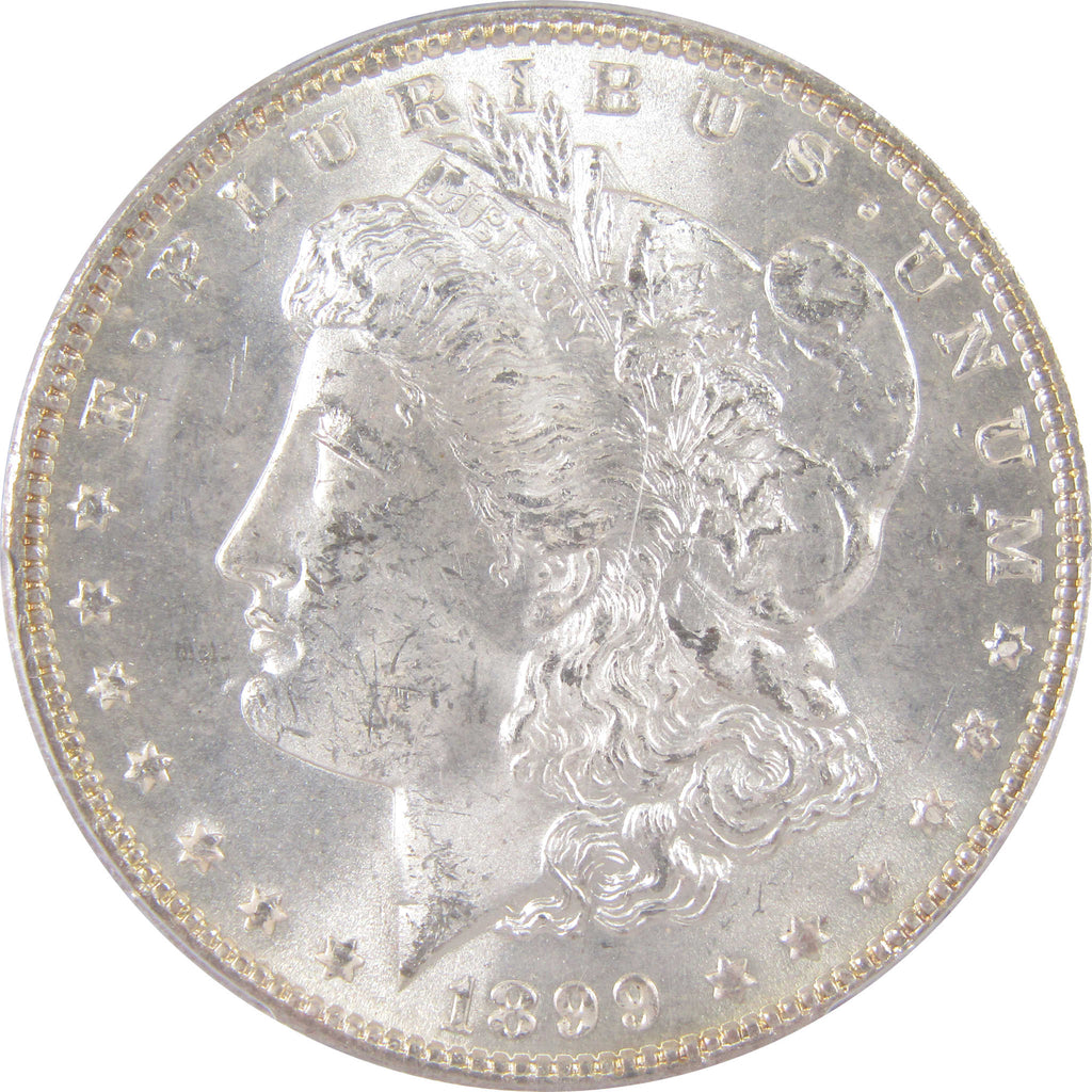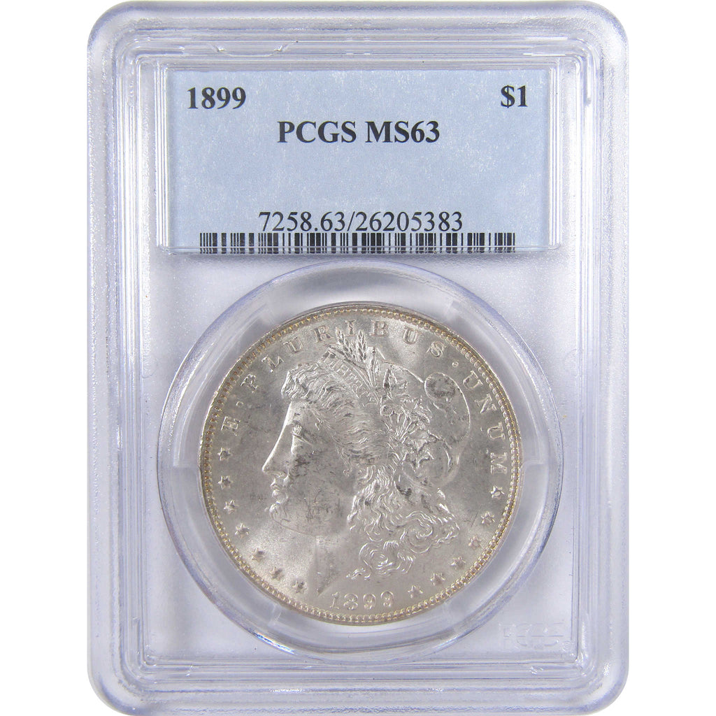 A genuine 1899 Morgan Silver Dollar Coin, graded and certified MS 63 by PCGS. Contains 90% Silver