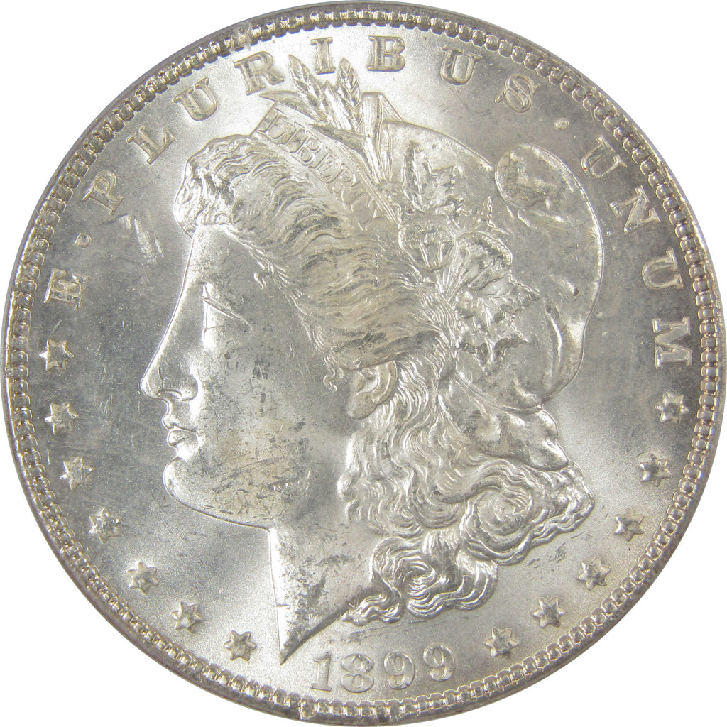 A genuine 1899 Morgan Silver Dollar Coin, graded and certified MS 64 by PCGS. Contains 90% Silver