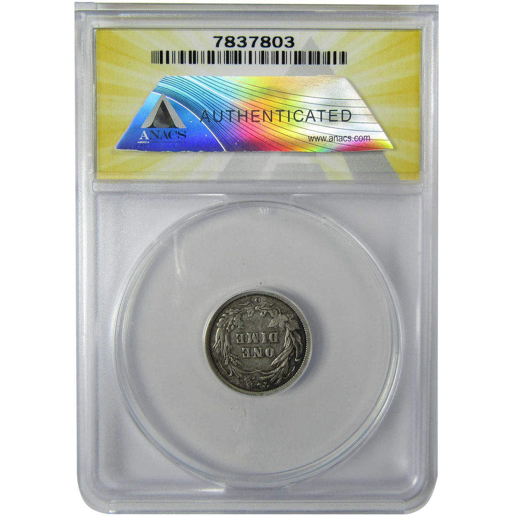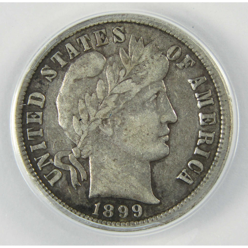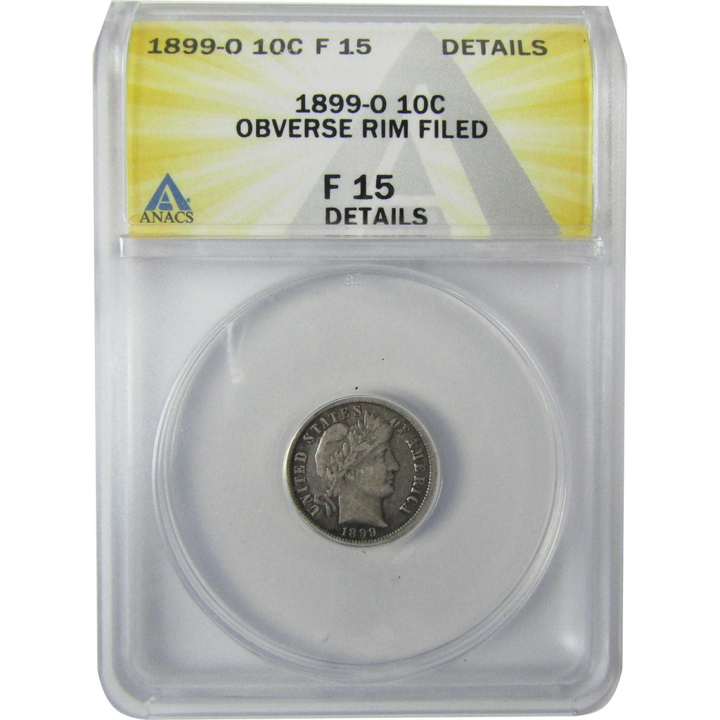 A genuine 1899 O Barber Silver Dime Coin, graded and certified F 15 Details by ANACS. Contains 90% Silver. Rim Filed