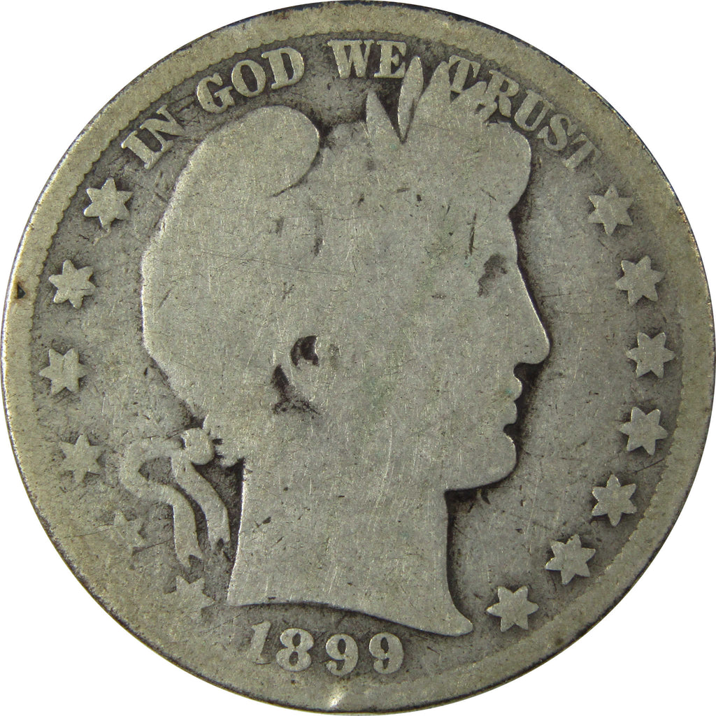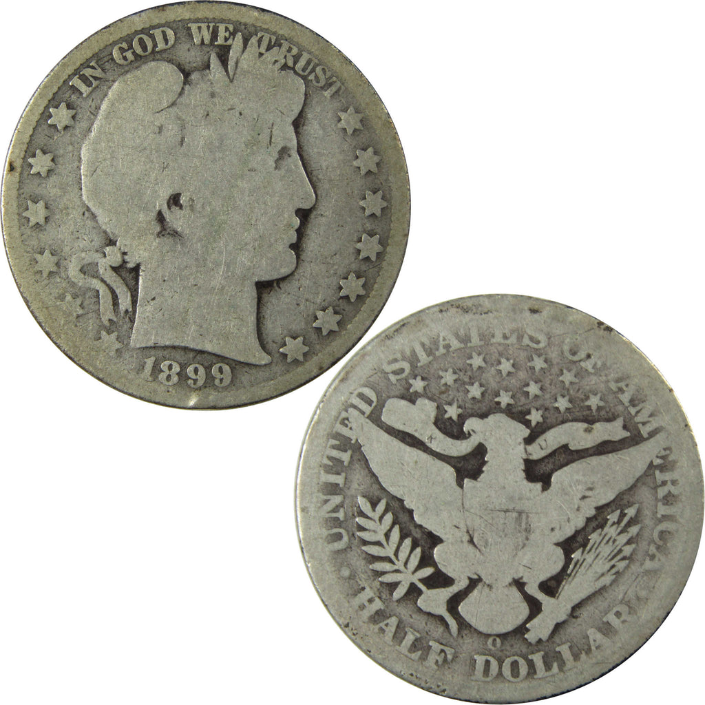 A genuine 1899 O Barber Silver Half Dollar Coin, in AG About Good Condition. Contains 90% Silver