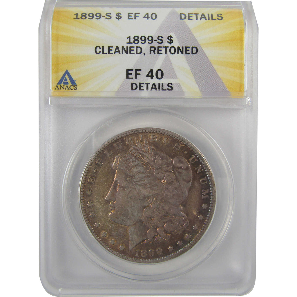 A genuine 1899 S Morgan Silver Dollar Coin, graded and certified EF 40 Details by ANACS. Contains 90% Silver. Cleaned & Retoned