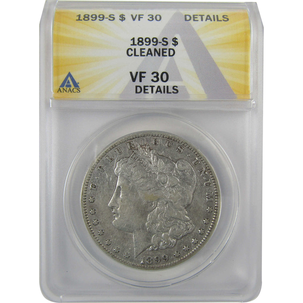 A genuine 1899 S Morgan Silver Dollar Coin, graded and certified VF 30 Details by ANACS. Contains 90% Silver. Cleaned