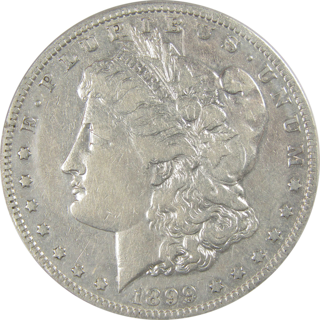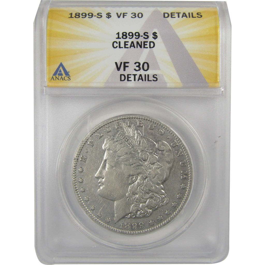A genuine 1899 S Morgan Silver Dollar Coin, graded and certified VF 30 Details by ANACS. Contains 90% Silver. Cleaned