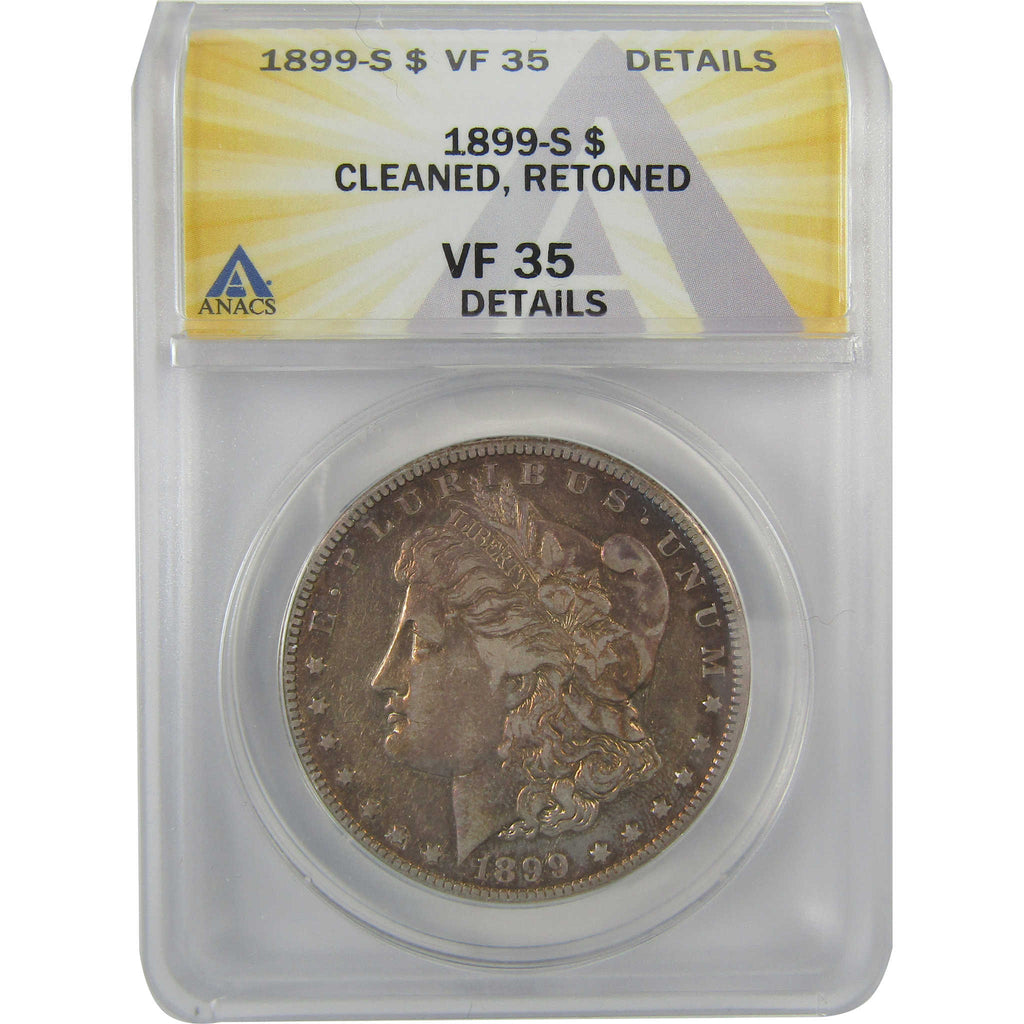 A genuine 1899 S Morgan Silver Dollar Coin, graded and certified VF 35 Details by ANACS. Contains 90% Silver. Cleaned & Retoned