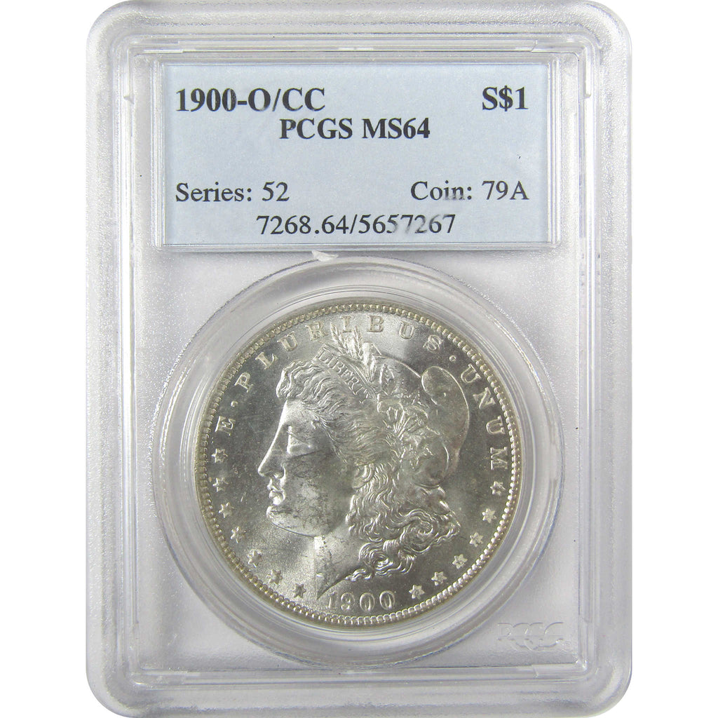 A genuine 1900 O/CC Morgan Silver Dollar Coin, graded and certified MS 64 by PCGS. Contains 90% Silver