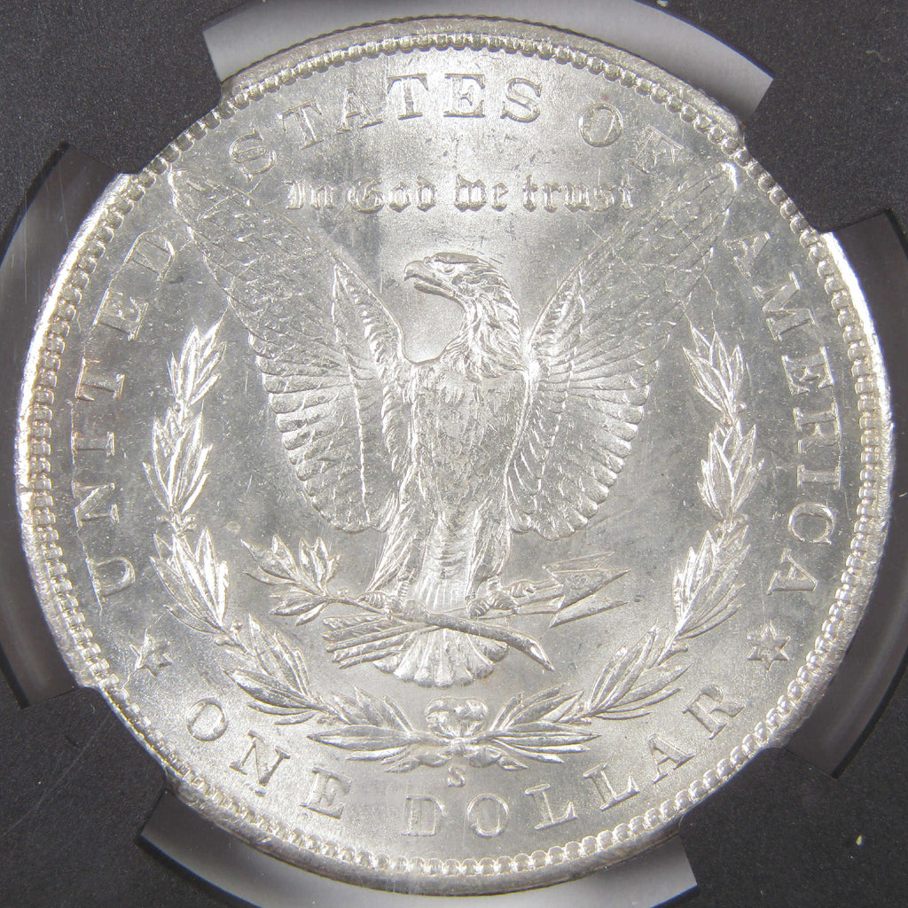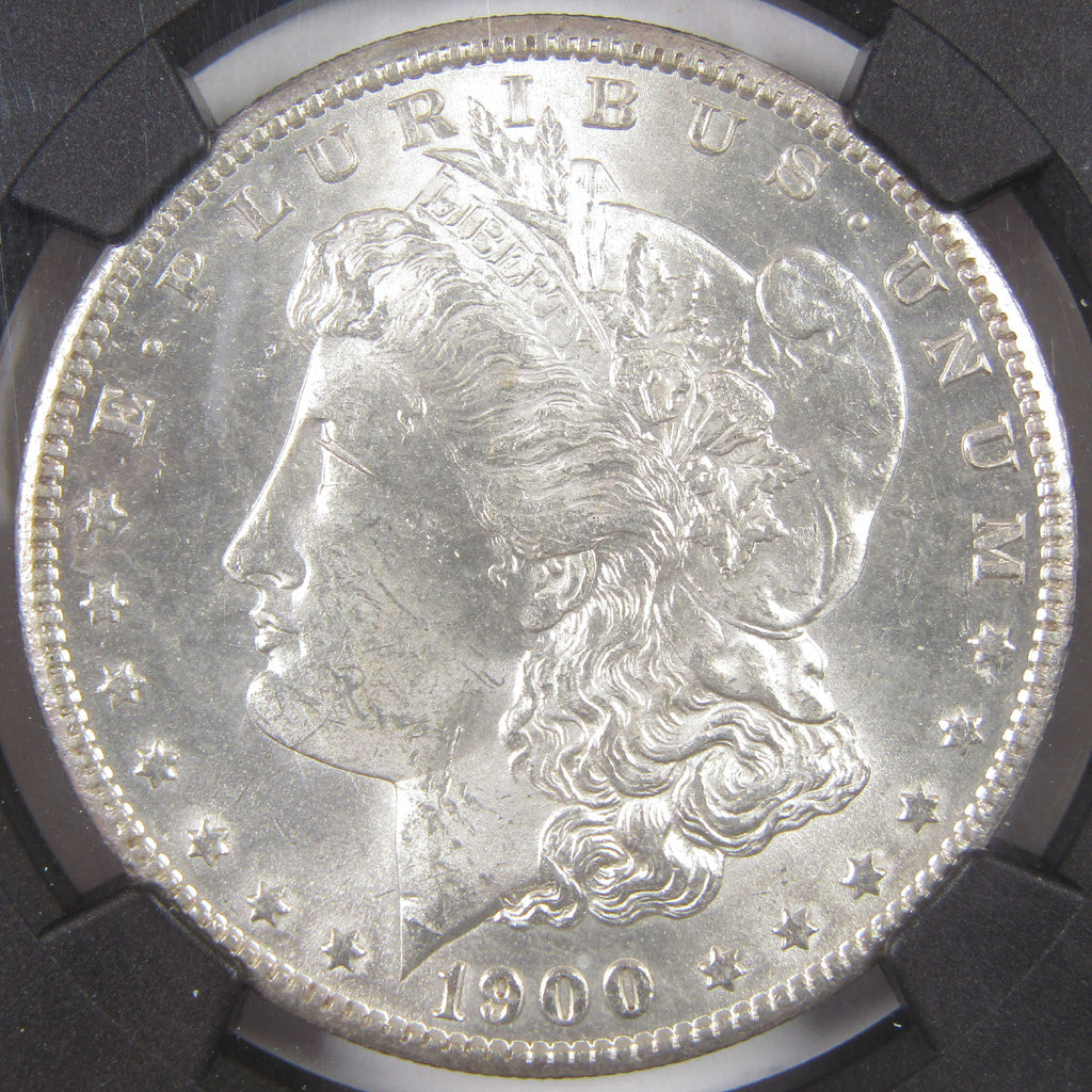 A genuine 1900 S Morgan Silver Dollar Coin, graded and certified MS 63 by NGC. Contains 90% Silver. Original Bag Fragment