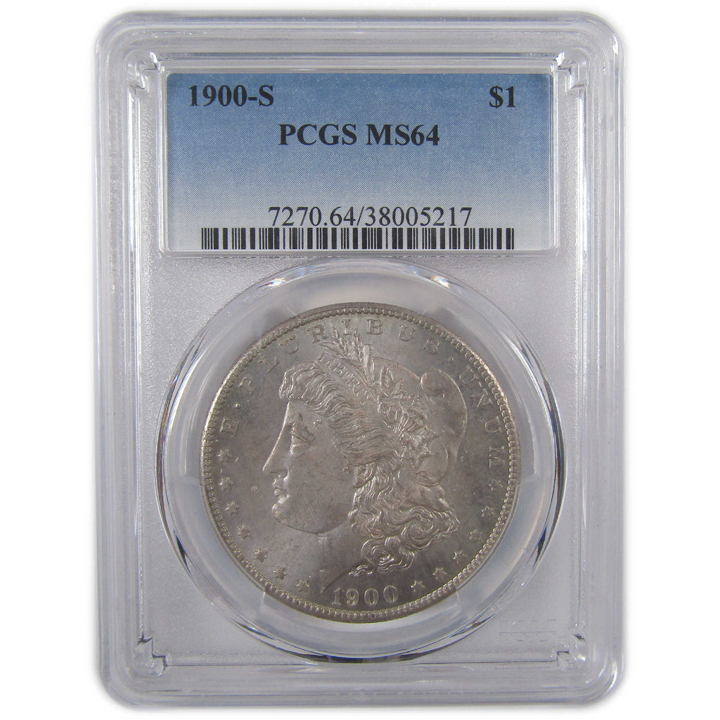 A genuine 1900 S Morgan Silver Dollar Coin, graded and certified MS 64 by PCGS. Contains 90% Silver