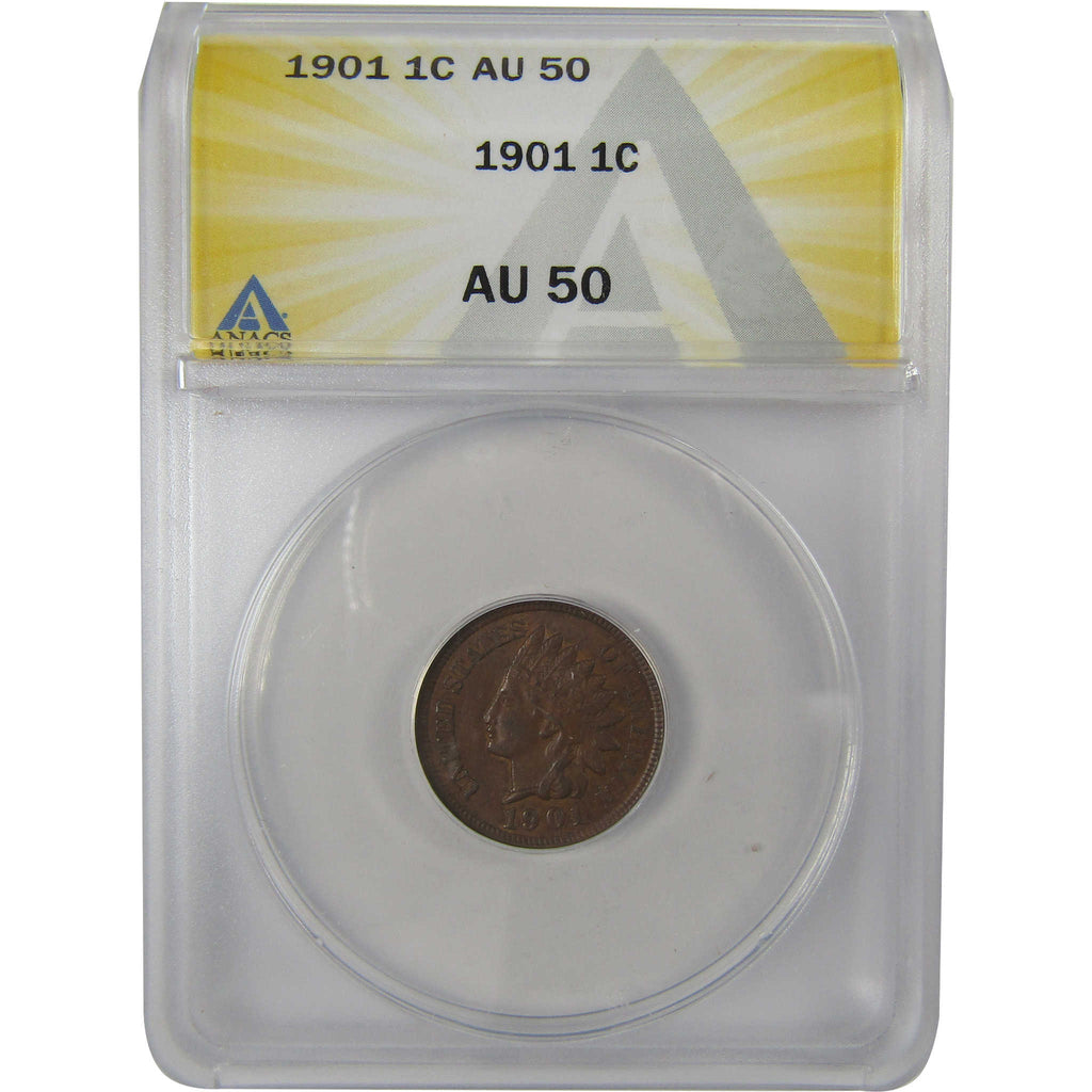 A genuine 1901 Indian Head Cent Penny Coin, graded and certified AU 50 by ANACS