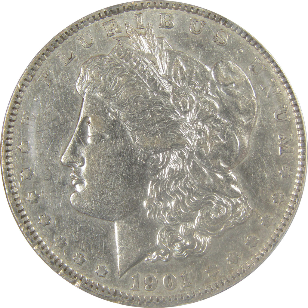A genuine 1901 Morgan Silver Dollar Coin, graded and certified AU 50 Details by ANACS. Contains 90% Silver. Cleaned