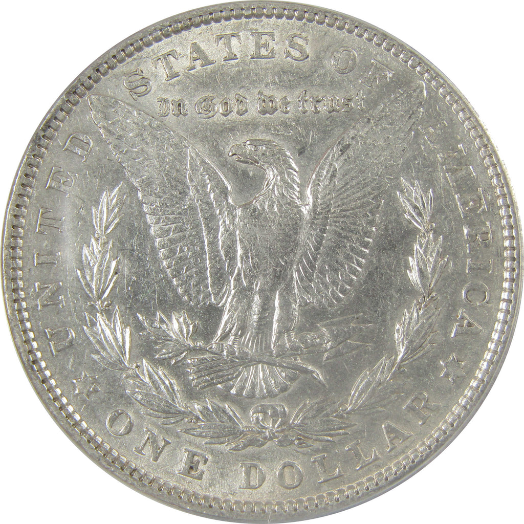 This large 90% silver Morgan dollar bears George T. Morgan's classic depiction of Liberty facing left in a Phrygian cap and a spray of leaves held by a ribbon inscribed LIBERTY. The reverse features an eagle clutching a branch and three arrows.