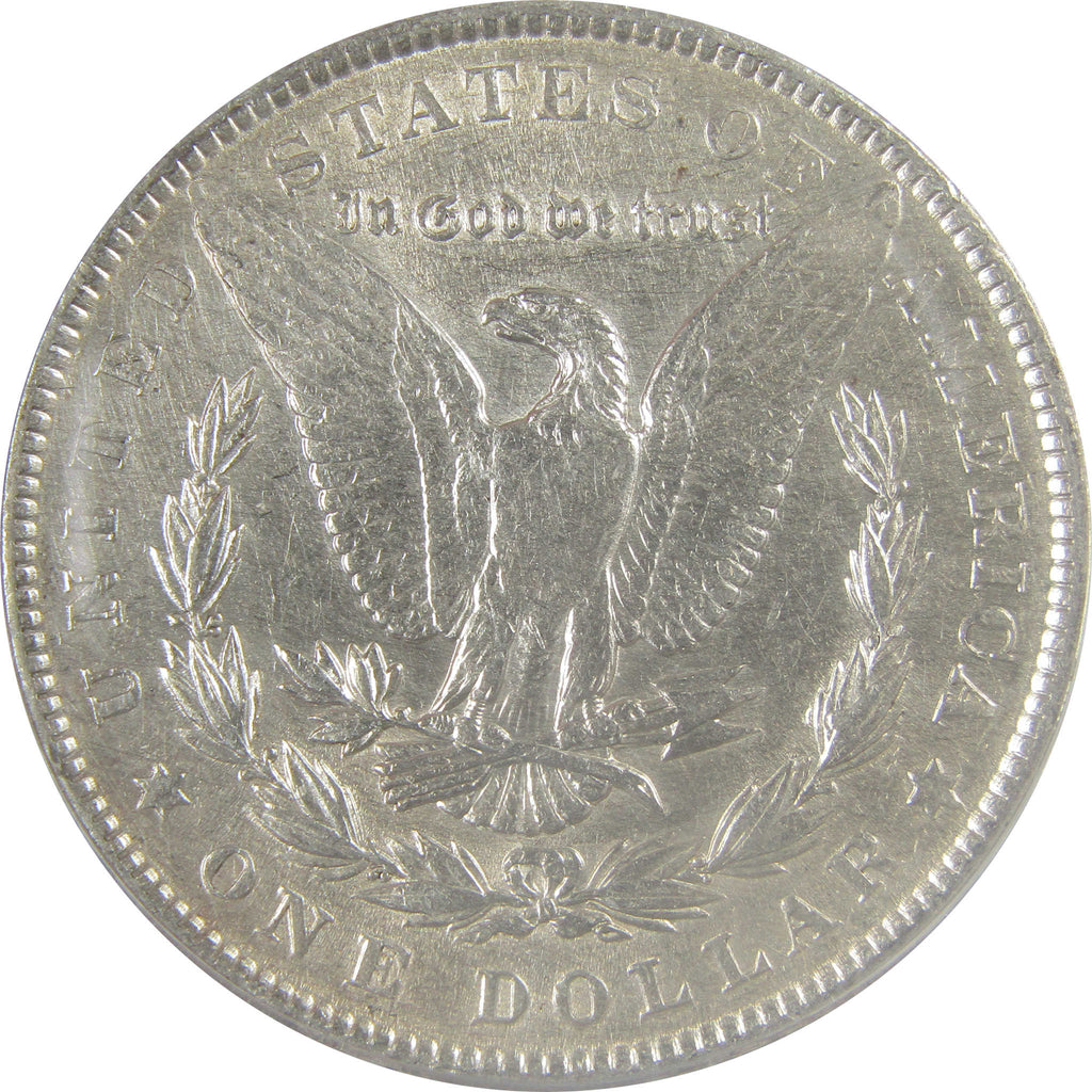 This large 90% silver Morgan dollar bears George T. Morgan's classic depiction of Liberty facing left in a Phrygian cap and a spray of leaves held by a ribbon inscribed LIBERTY. The reverse features an eagle clutching a branch and three arrows.