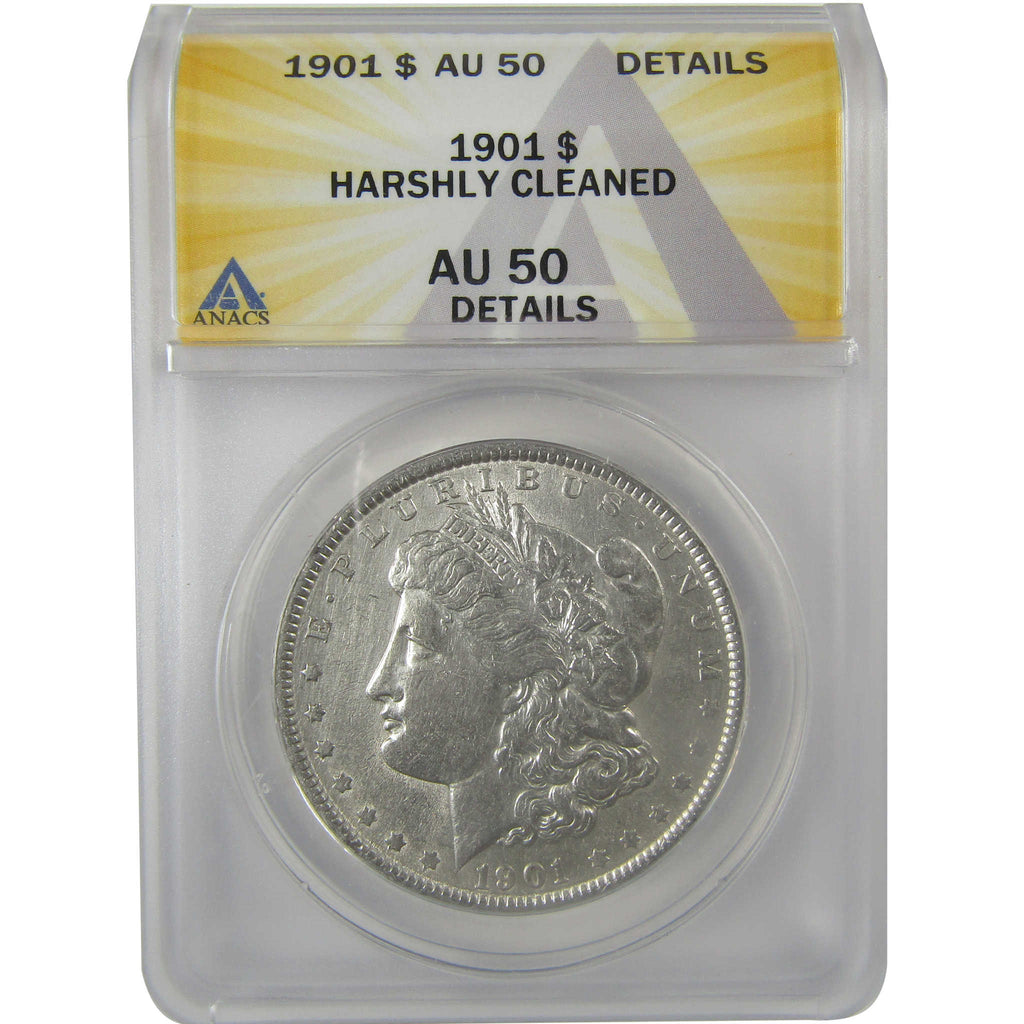A genuine 1901 Morgan Silver Dollar Coin, graded and certified AU 50 Details by ANACS. Contains 90% Silver. Harshly Cleaned