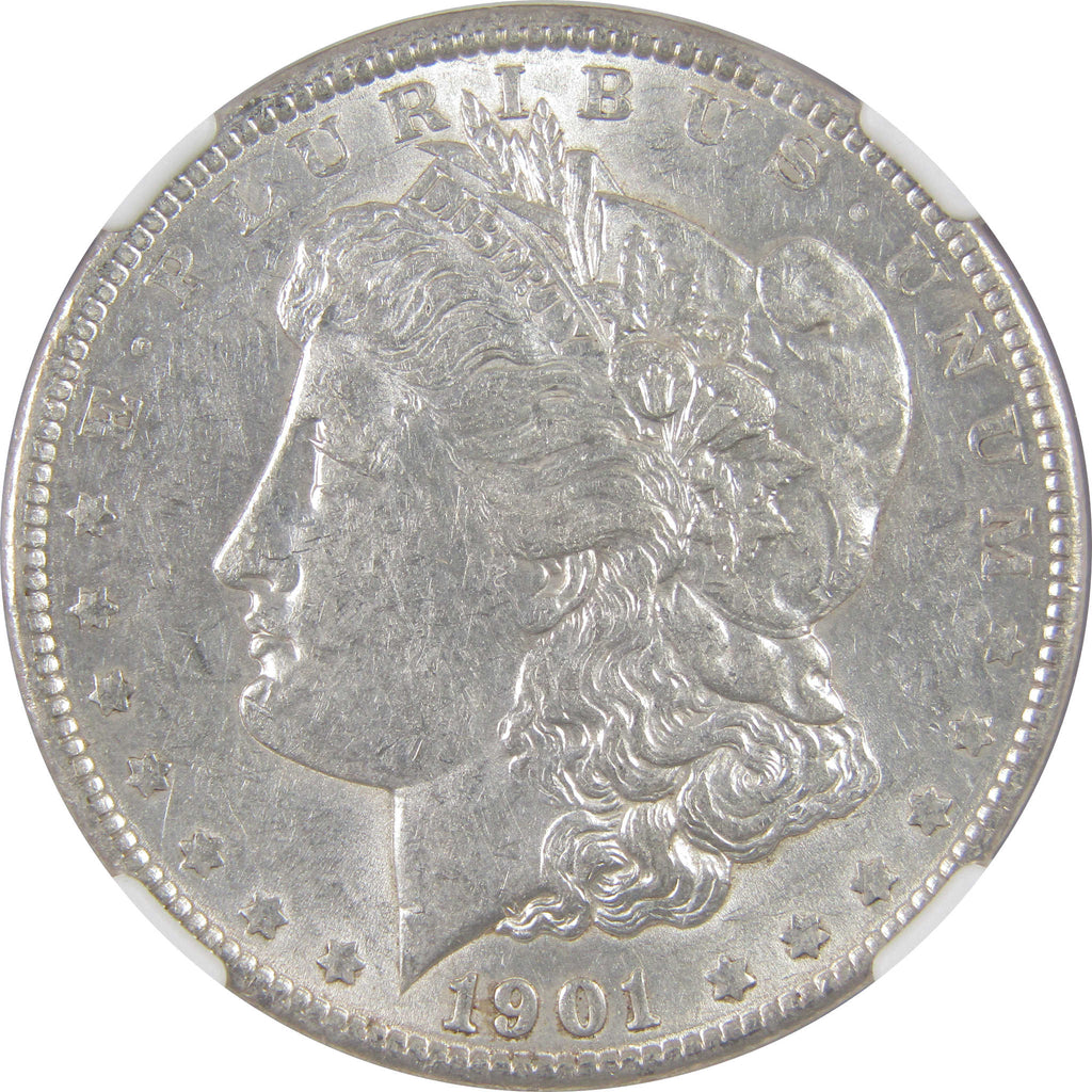 A genuine 1901 Morgan Silver Dollar Coin, graded and certified AU 53 by NGC. Contains 90% Silver