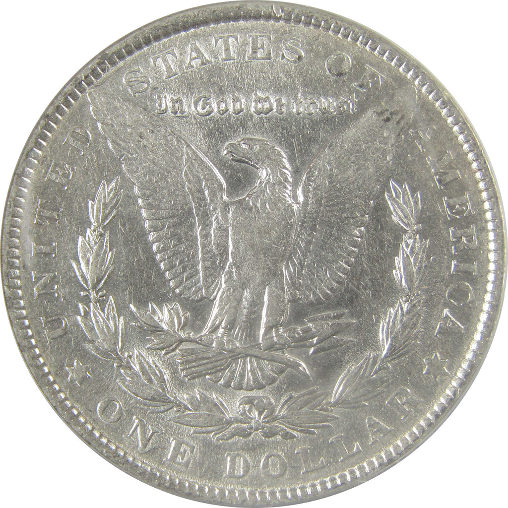 This large 90% silver Morgan dollar bears George T. Morgan's classic depiction of Liberty facing left in a Phrygian cap and a spray of leaves held by a ribbon inscribed LIBERTY. The reverse features an eagle clutching a branch and three arrows.