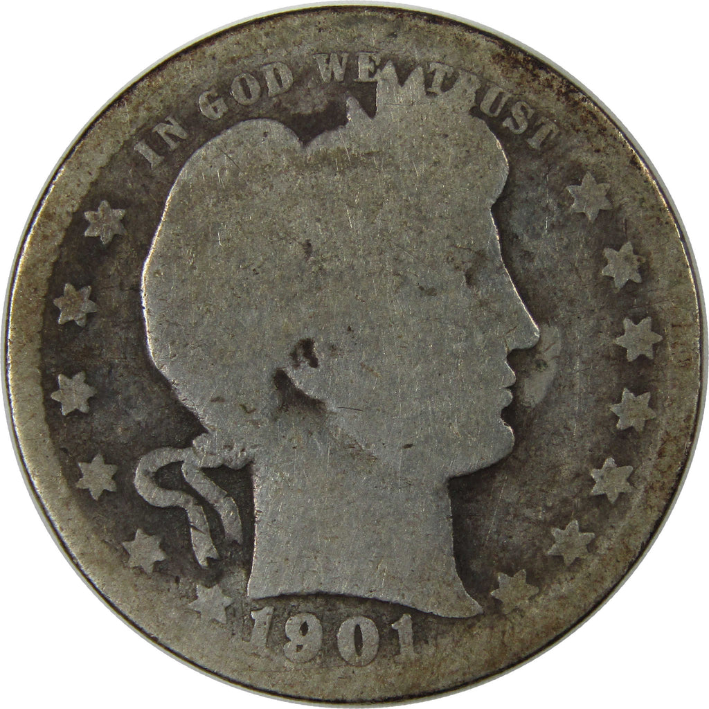 A genuine 1901 O Barber Silver Quarter Coin, in AG About Good Details Condition. Contains 90% Silver. Cleaned