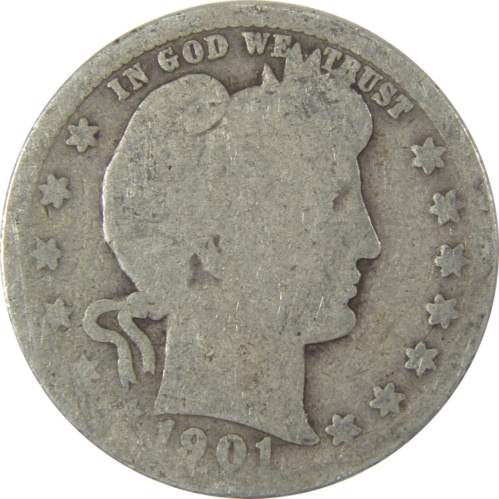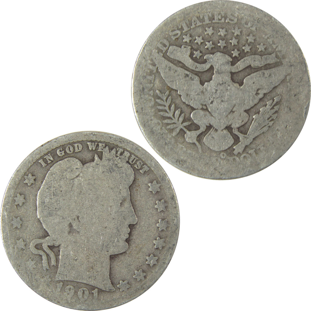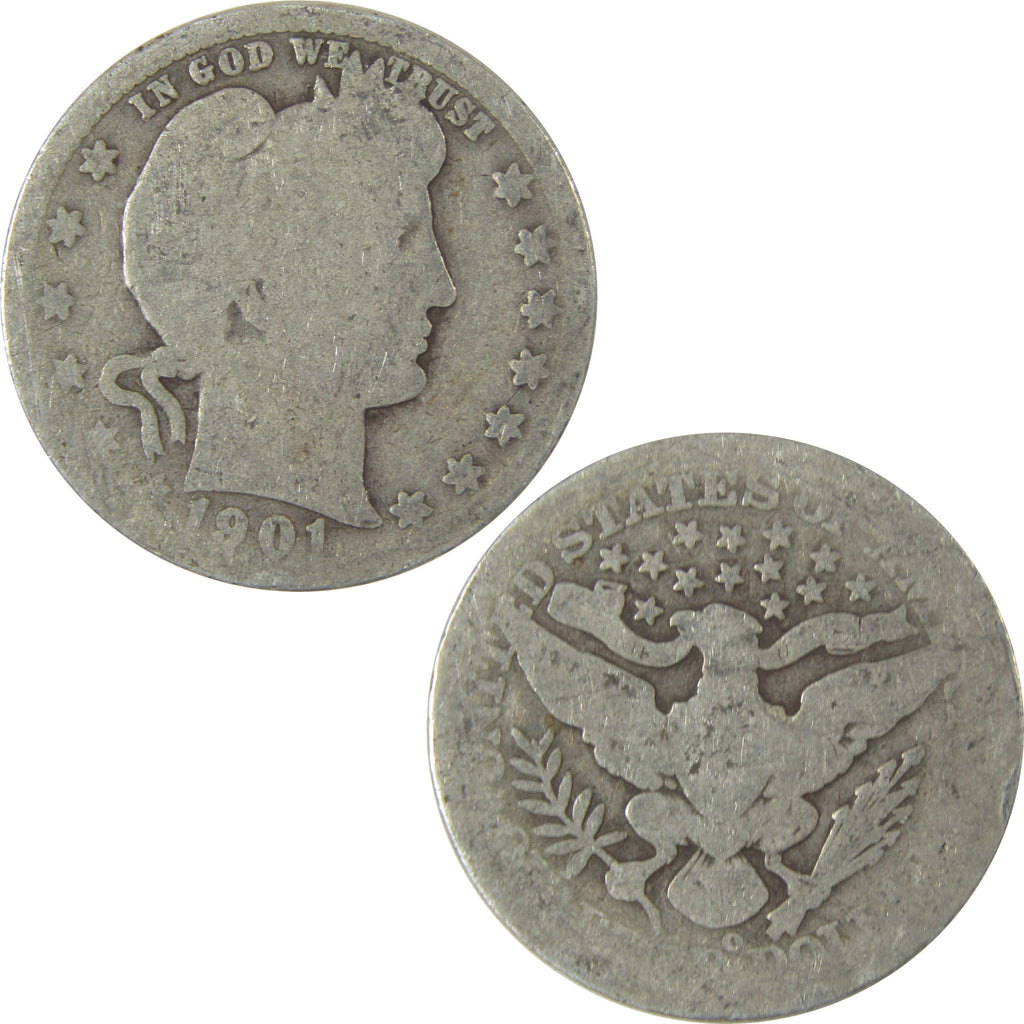 A genuine 1901 O Barber Silver Quarter Coin, in AG About Good Condition. Contains 90% Silver