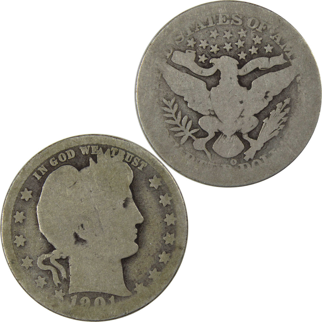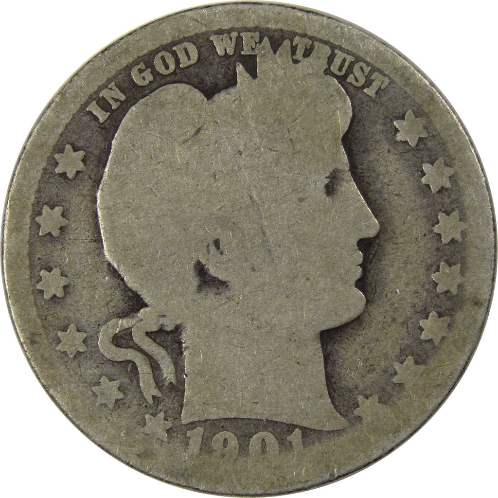 A genuine 1901 O Barber Silver Quarter Coin, in AG About Good Condition. Contains 90% Silver