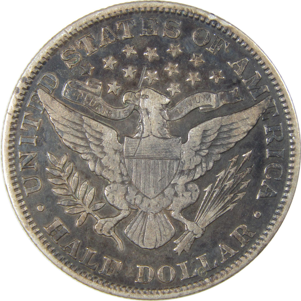 This 90% silver Liberty Head half dollar (or Barber half dollar) bears Charles E. Barber's classic depiction of Liberty wearing a laurel wreath and Phrygian cap held by a band inscribed LIBERTY. The reverse bears an adaptation of the Great Seal of the United States.