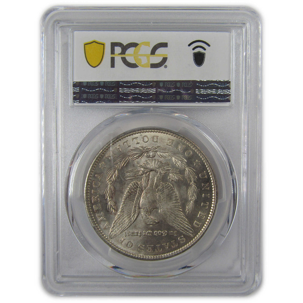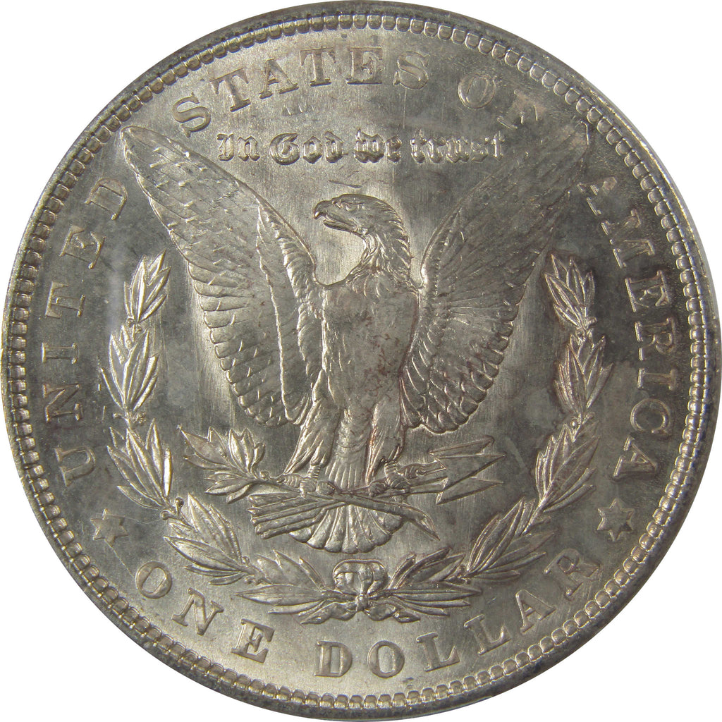 This large 90% silver Morgan dollar bears George T. Morgan's classic depiction of Liberty facing left in a Phrygian cap and a spray of leaves held by a ribbon inscribed LIBERTY. The reverse features an eagle clutching a branch and three arrows.