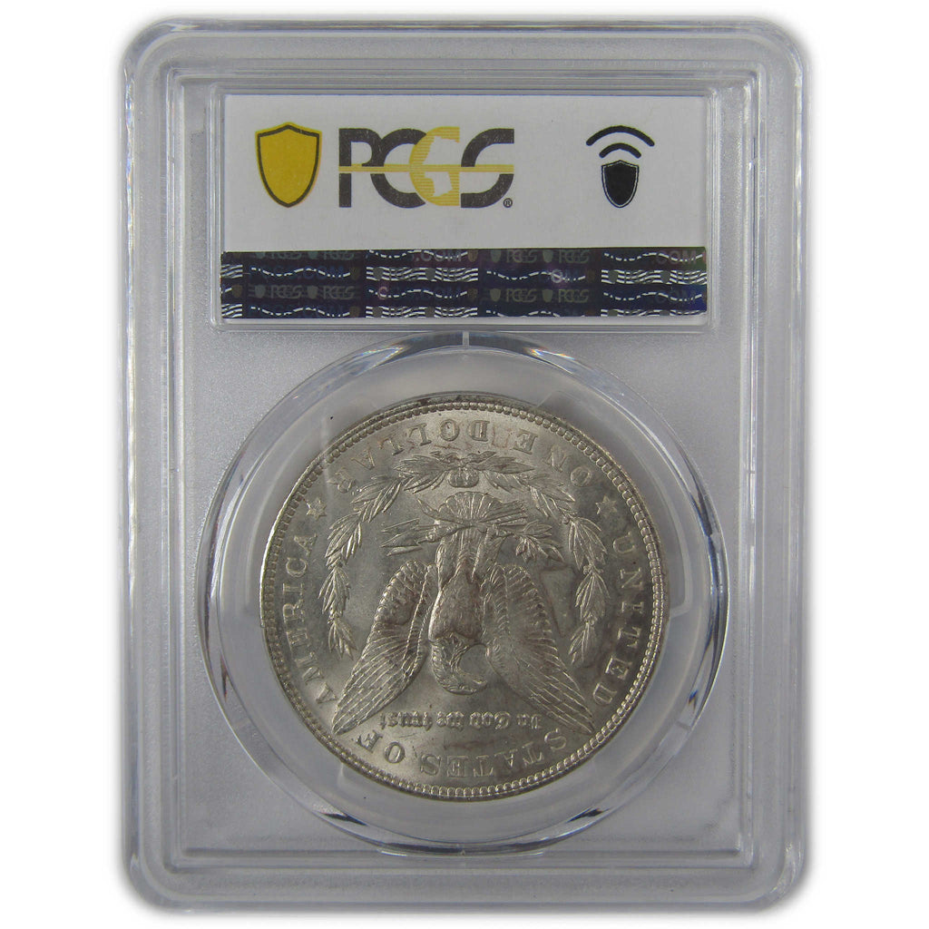 This large 90% silver Morgan dollar bears George T. Morgan's classic depiction of Liberty facing left in a Phrygian cap and a spray of leaves held by a ribbon inscribed LIBERTY. The reverse features an eagle clutching a branch and three arrows.