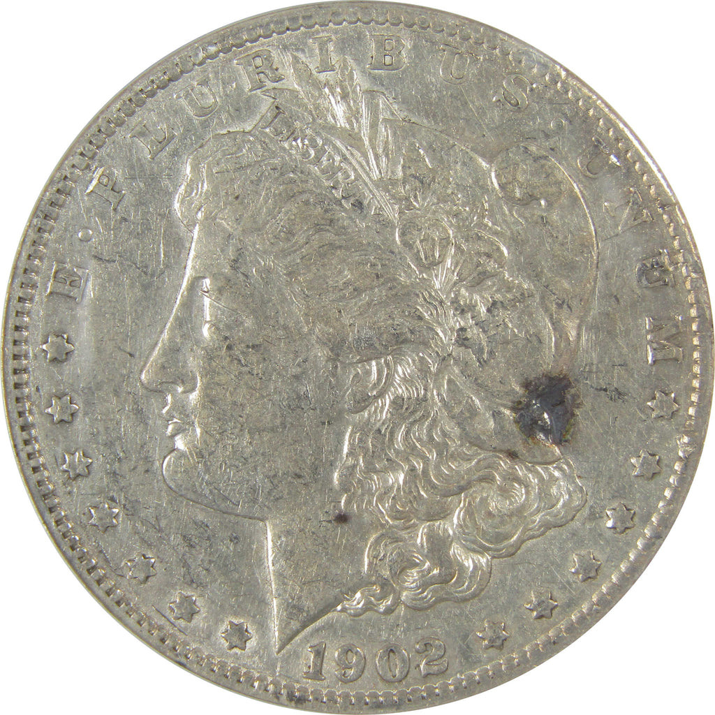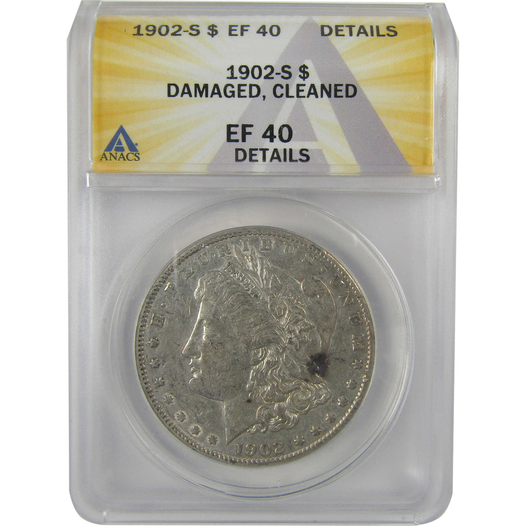 A genuine 1902 S Morgan Silver Dollar Coin, graded and certified EF 40 Details by ANACS. Contains 90% Silver. Damaged, Cleaned