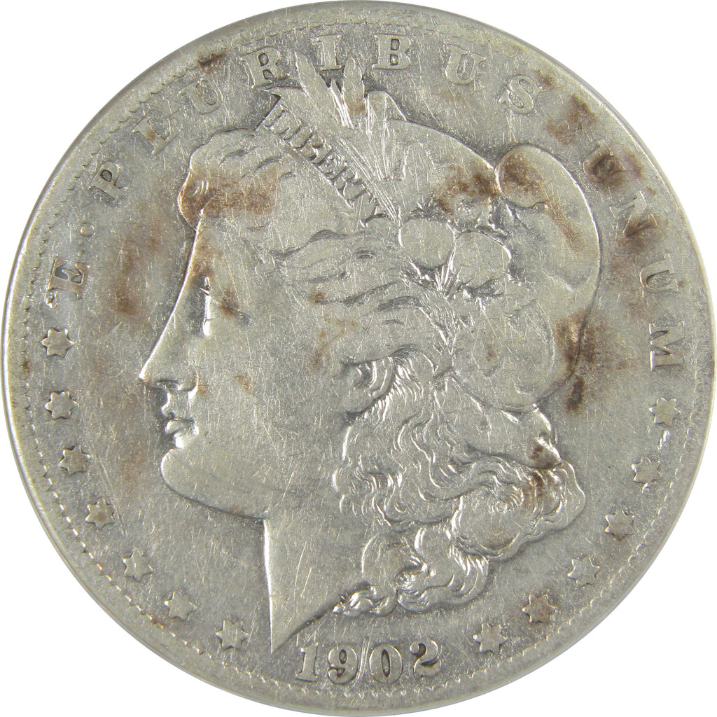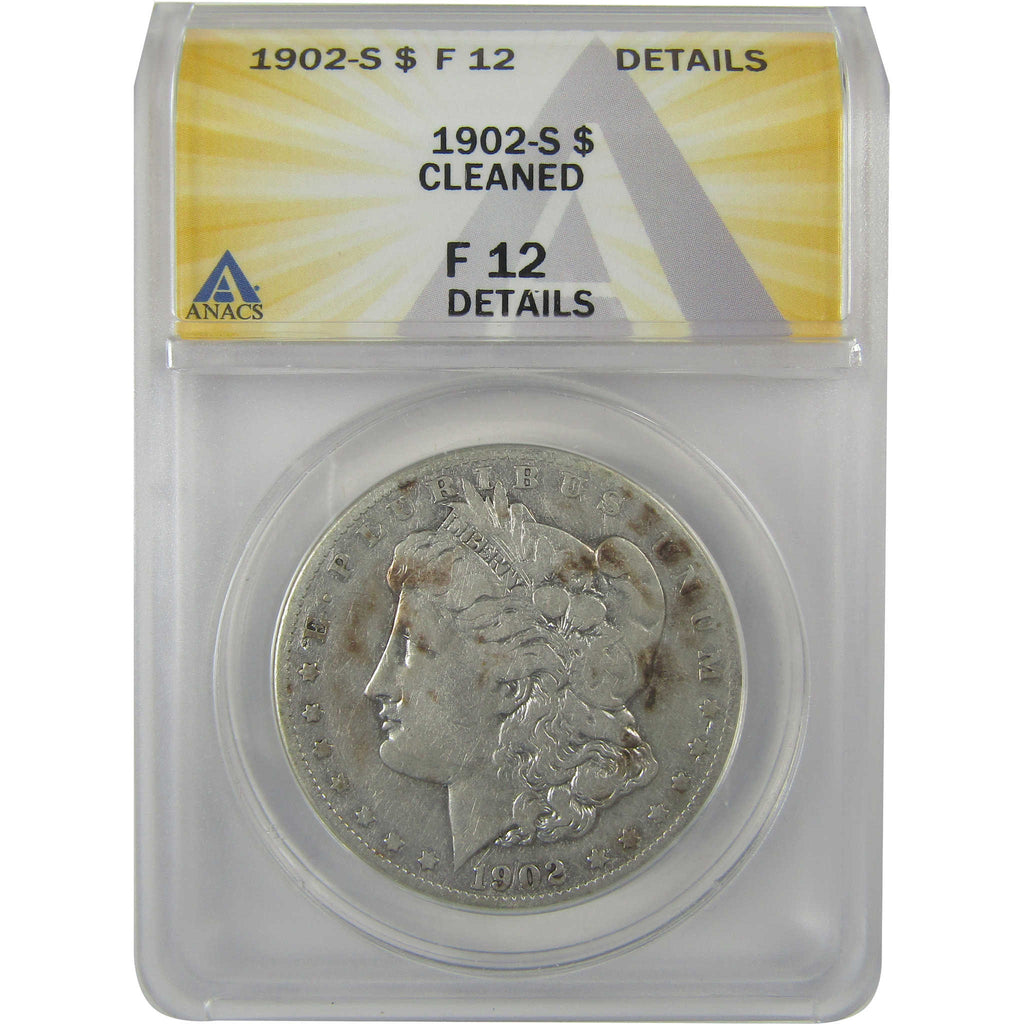 A genuine 1902 S Morgan Silver Dollar Coin, graded and certified F 12 Details by ANACS. Contains 90% Silver. Cleaned