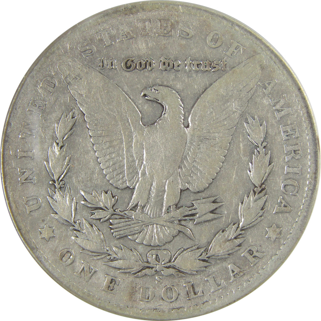 This large 90% silver Morgan dollar bears George T. Morgan's classic depiction of Liberty facing left in a Phrygian cap and a spray of leaves held by a ribbon inscribed LIBERTY. The reverse features an eagle clutching a branch and three arrows.