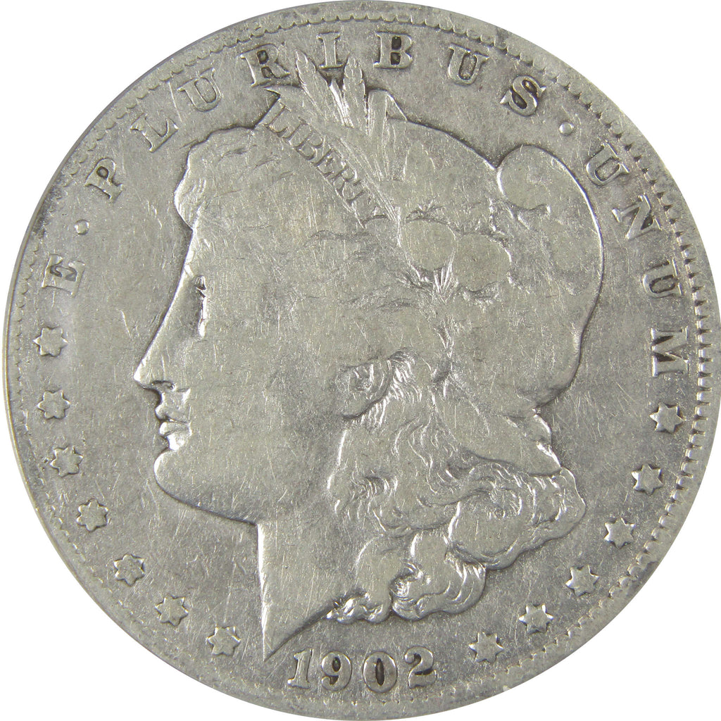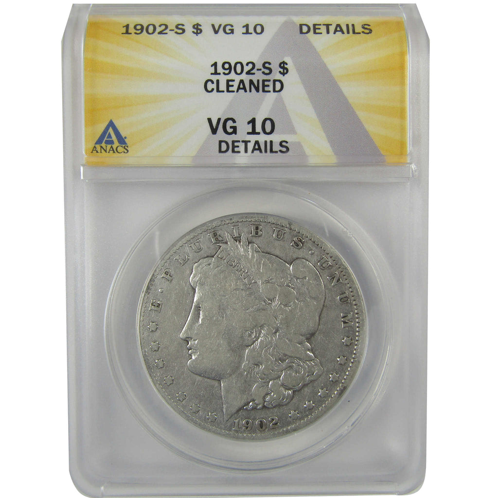 A genuine 1902 S Morgan Silver Dollar Coin, graded and certified VG 10 Details by ANACS. Contains 90% Silver. Cleaned