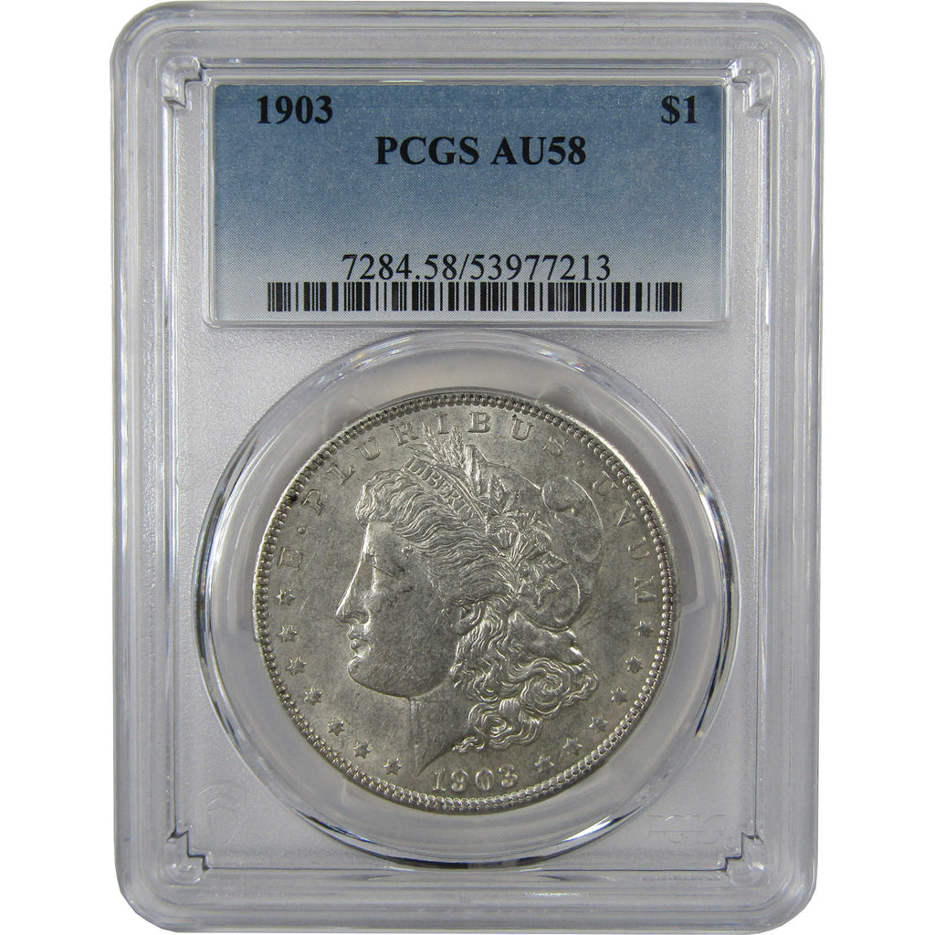 A genuine 1903 Morgan Silver Dollar Coin, graded and certified AU 58 by PCGS. Contains 90% Silver