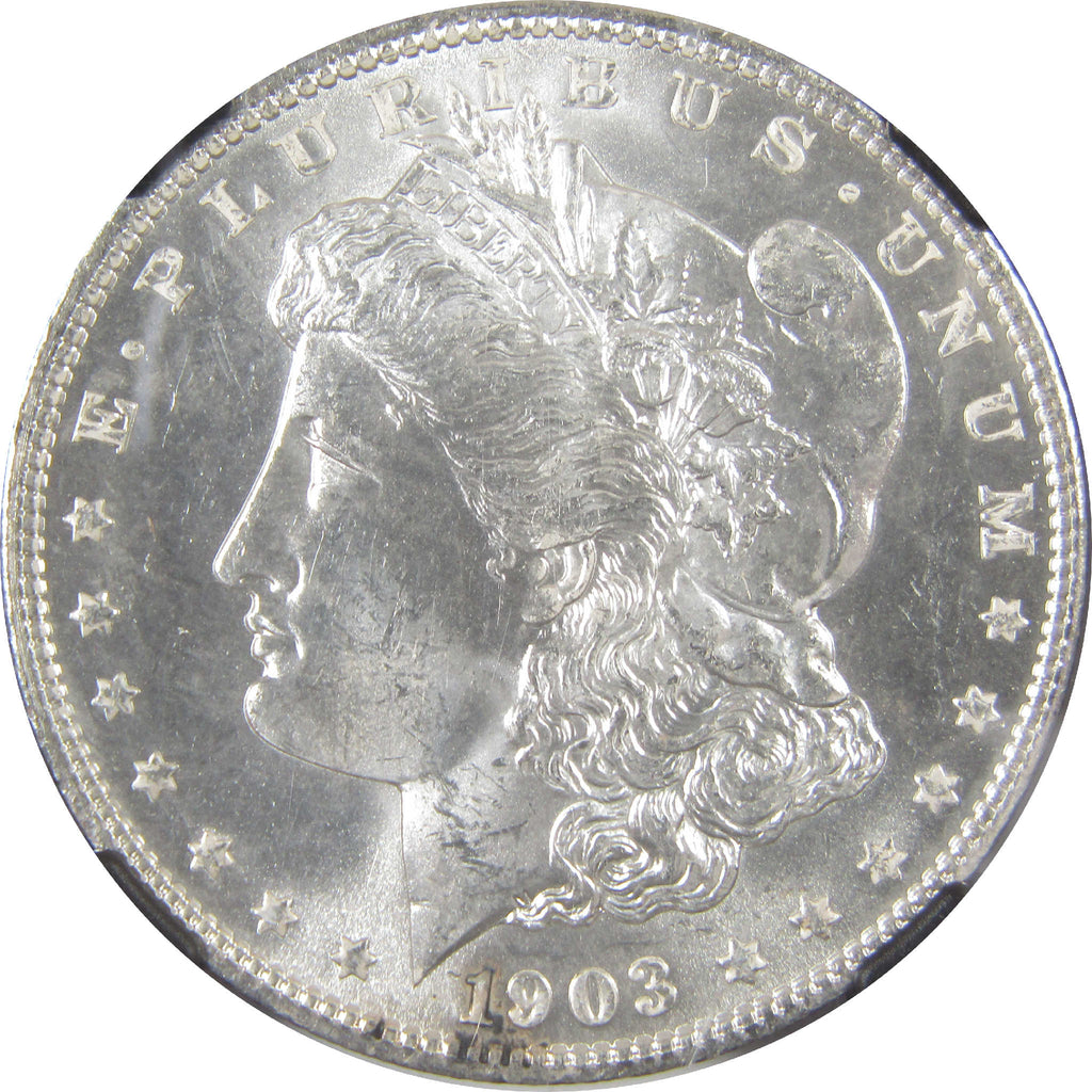 A genuine 1903 O Morgan Silver Dollar Coin, graded and certified MS 63 by NGC. Contains 90% Silver. Original Bag Fragment